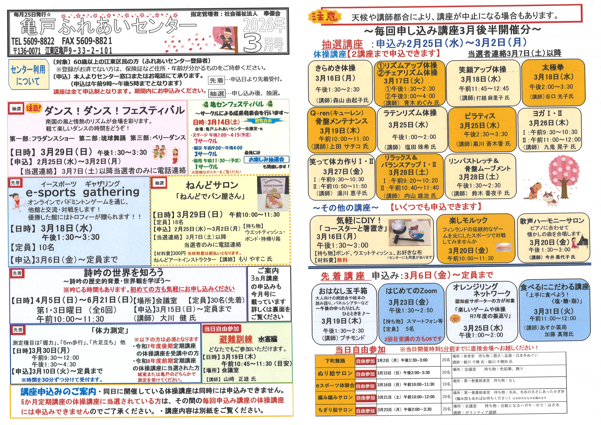 2026.02.25 お知らせ 2026年亀戸ふれあいセンター3月号おたより Tweet シェアする 2026年亀戸ふれあいセンター3月号おたより完成しました。 ↑印刷をしたい方はこちらをクリックしてPDFファイルを表示させてください。 一覧へ戻る