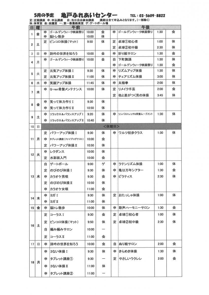 2026.04.25 お知らせ 2026年亀戸ふれあいセンター5月号予定表 Tweet シェアする 2026年亀戸ふれあいセンター5月号予定表が完成しました。 ↑印刷をしたい方はこちらをクリックしてPDFファイルを表示させてください。 一覧へ戻る