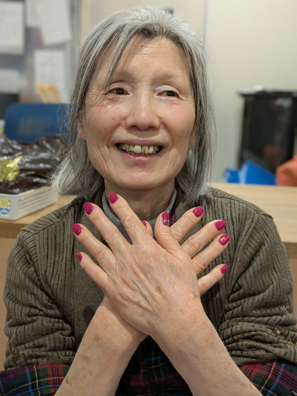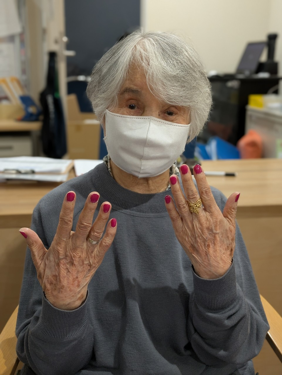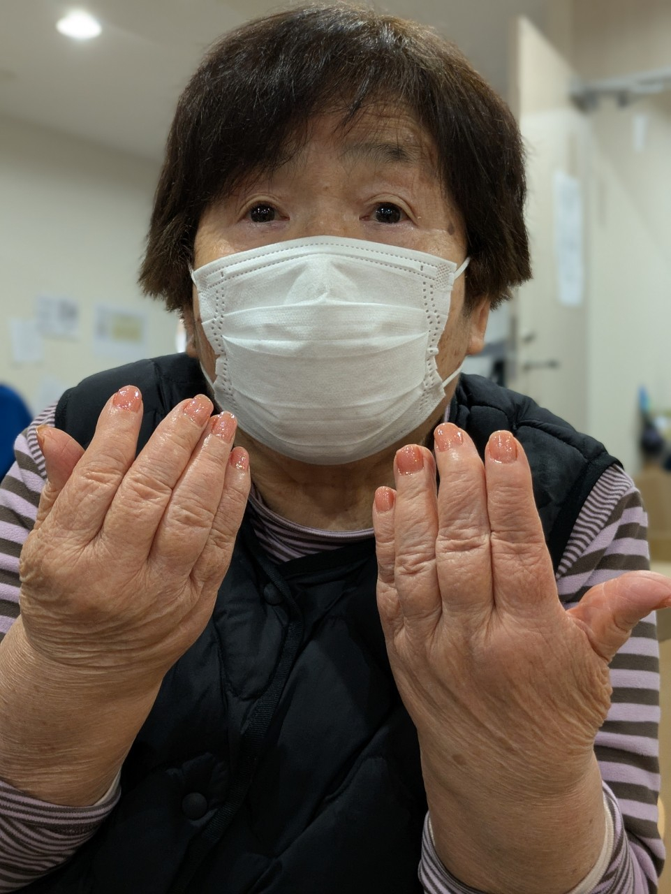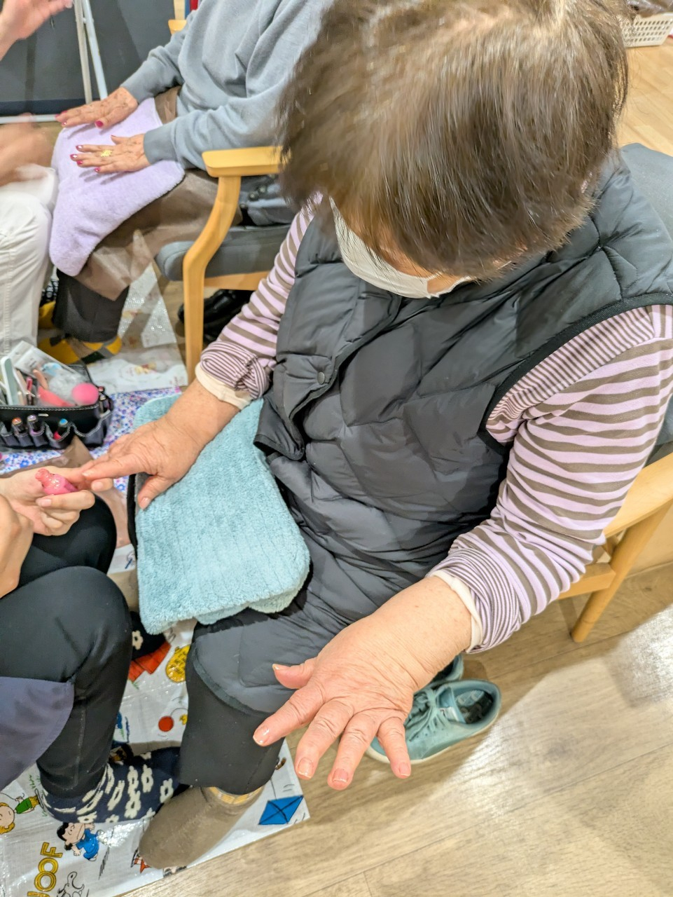 1回目の先週、社交ダンスがお得意だったとお話の中にあり、ダンスに合うようなスカートを用意して下さり、マニキュアのお好みの色をお聞きし、ステップのために足の運動♪
