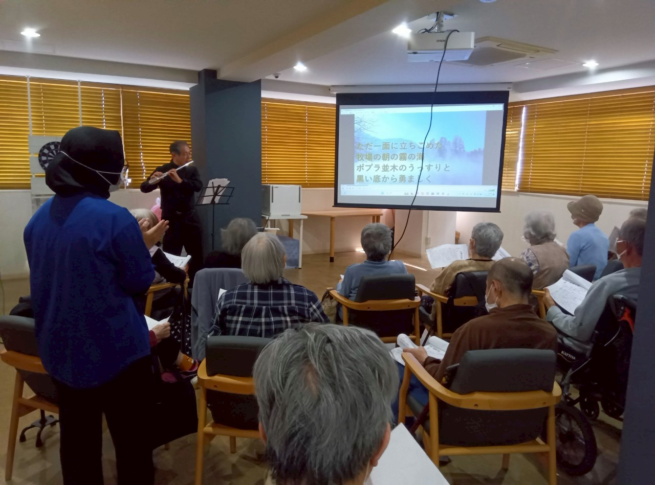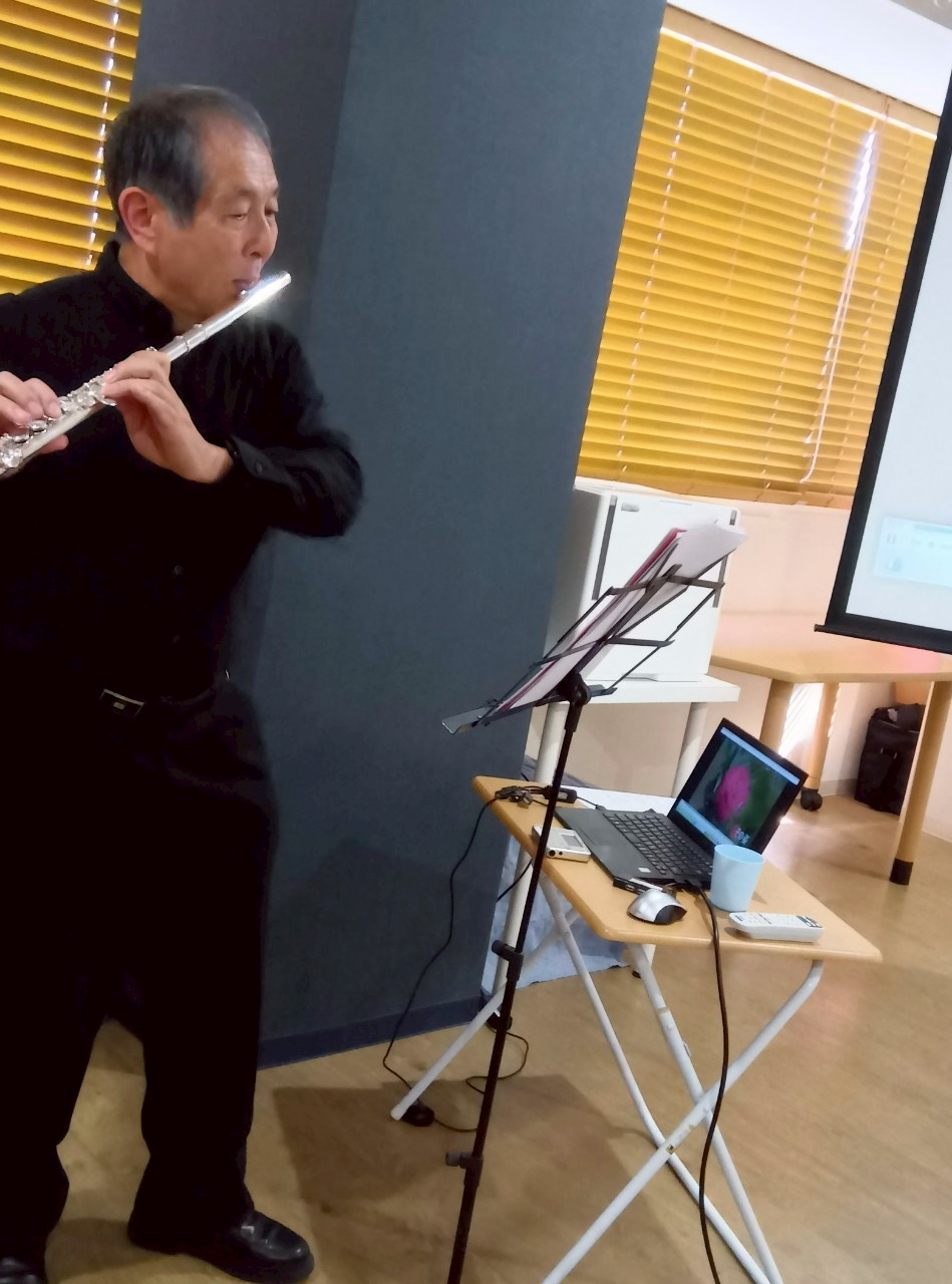 最初は少し緊張されていらっしゃったようですが、『私はフルートの音が大好きなんです!』と、『若葉』や『朧月夜』などの唱歌や童謡。『学生時代』、『いつでも夢を』、『この広い野原いっぱい』などの歌謡曲をフルートのとっても綺麗な音で聴かせて下さいました☆