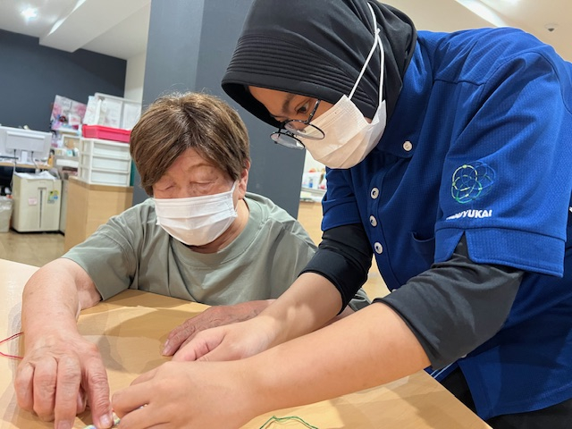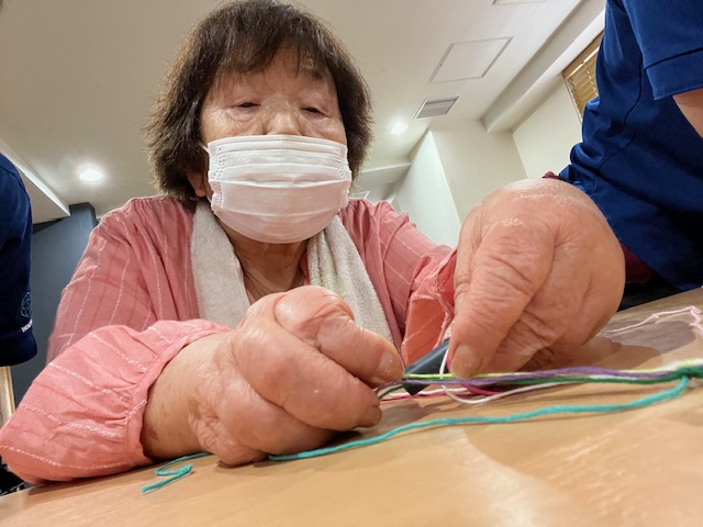 『やることはわかるんだけどやるのがねぇ・・・・・』、『手が震えて上手く通せない・・・・・』など、とっても苦戦されていらっしゃいましたが、ゆっくりでも諦めず一編み一編みしっかりと編んでいらっしゃいました(*^_^*)