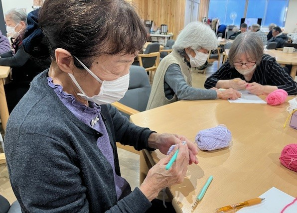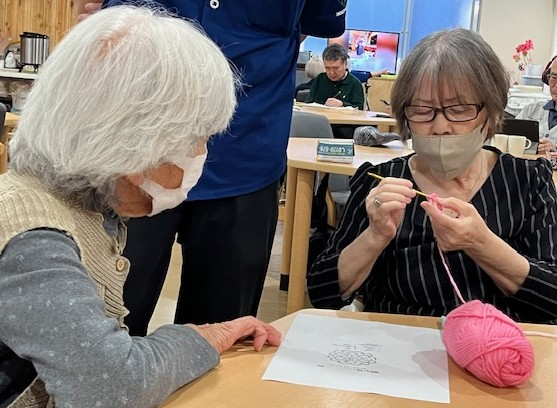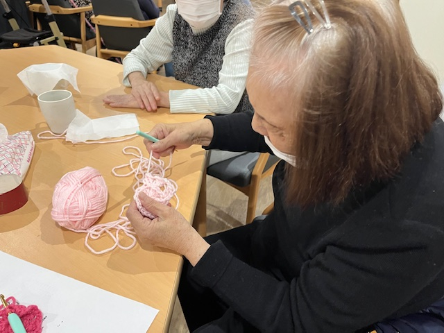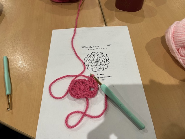 「ここが鎖3つにしてから長編みだから-」と丁寧に説明しながら、教えていきます。