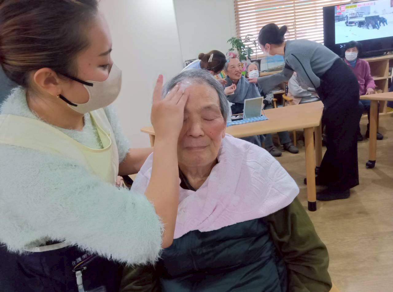 介護美容研究所のみなさんには、毎回『ハンド、フットマッサージ』、『フェイススキンケア』、『ネイル』、『メイク』などをしていただき、ご利用者のみなさんを笑顔にしてくださっています(*^-^*)