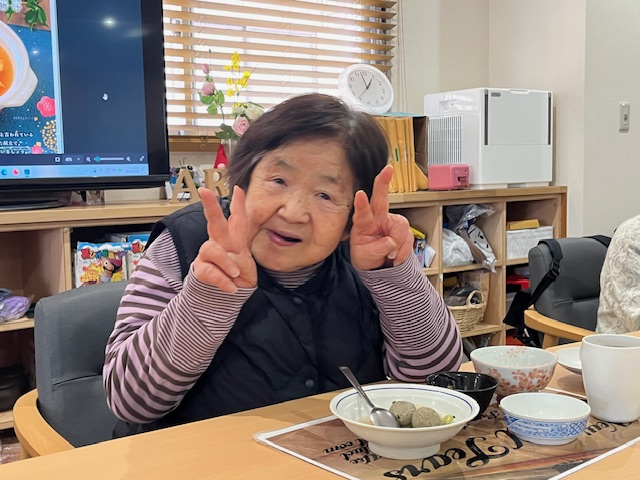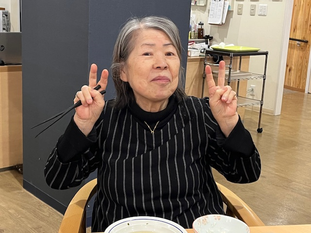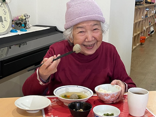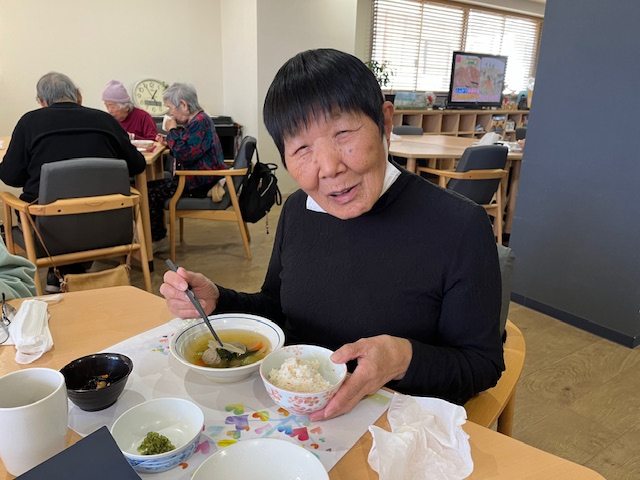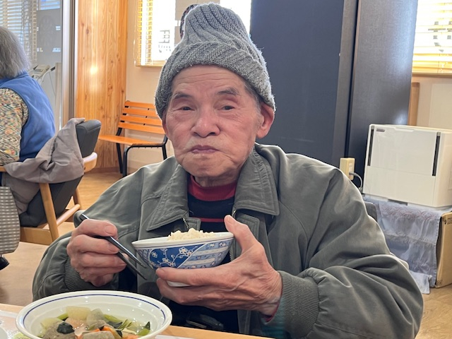 カニ飯にみなさんワクワク♪いわしのつみれ汁で温まり。
