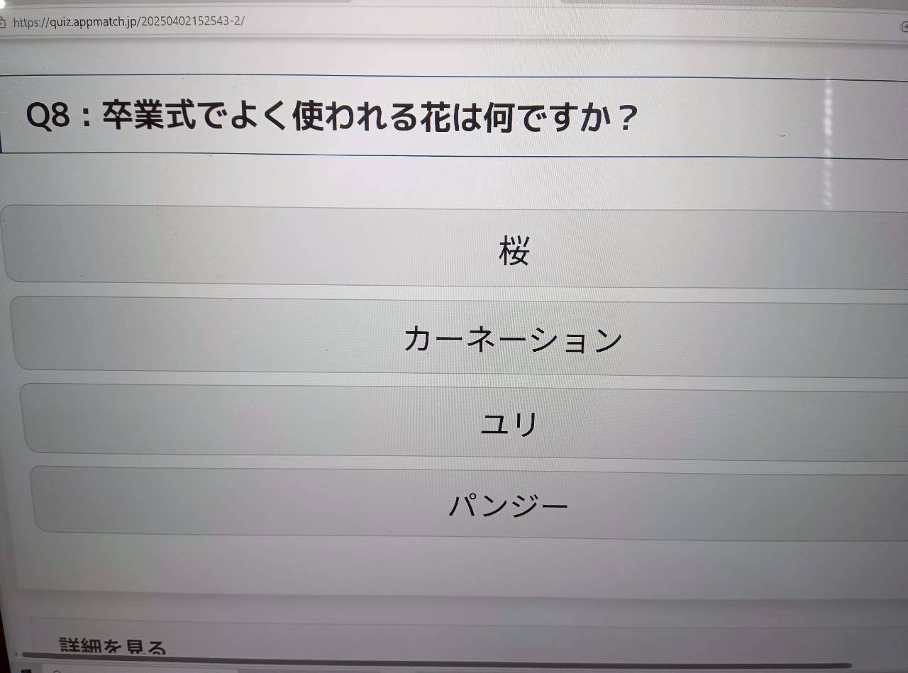『カーネーションでしょ?』、『ユリじゃない?』、『桜よ!』と3つに意見が分かれましたが、正解は『桜』。