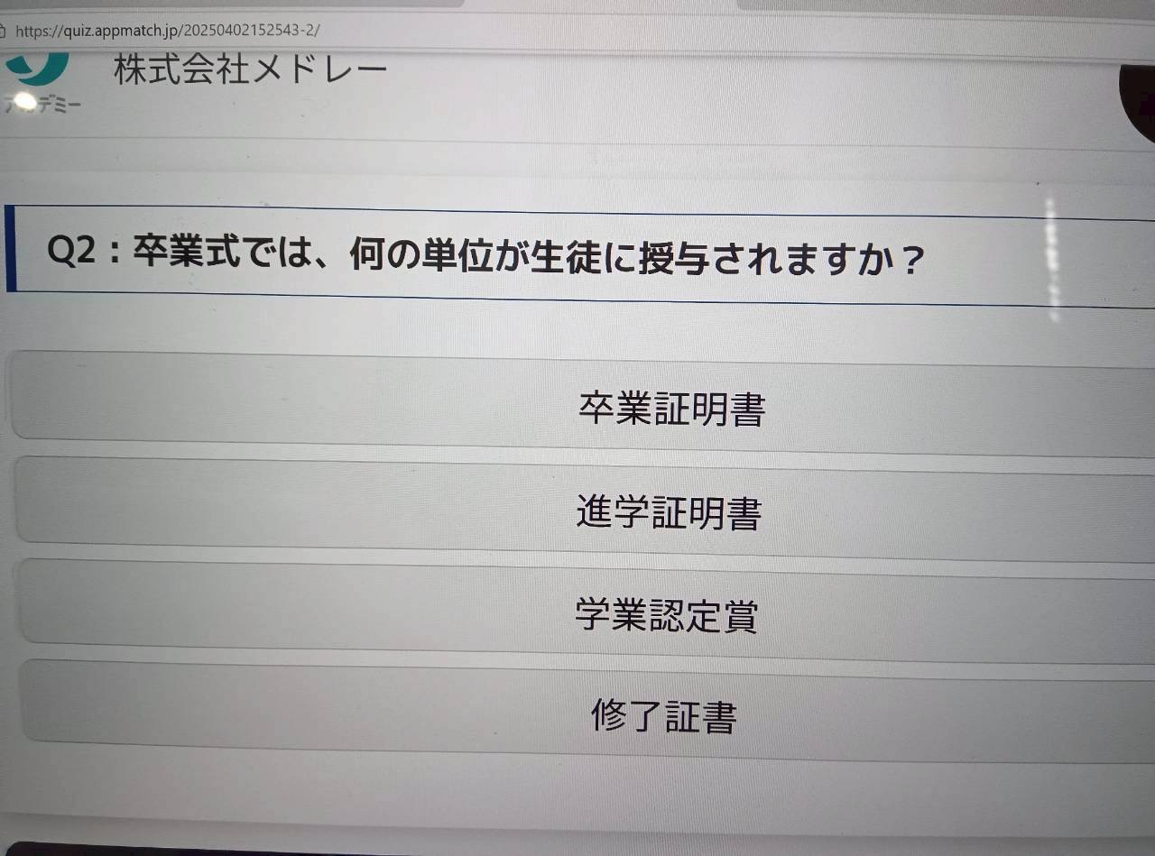 ということで、本日のスクリーン前は、体操の後『卒業式クイズ』を行いました☆