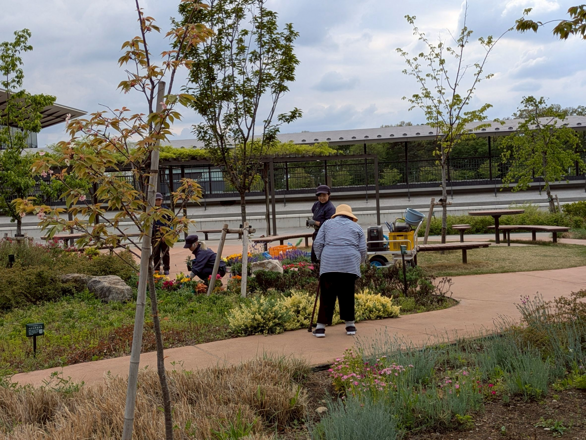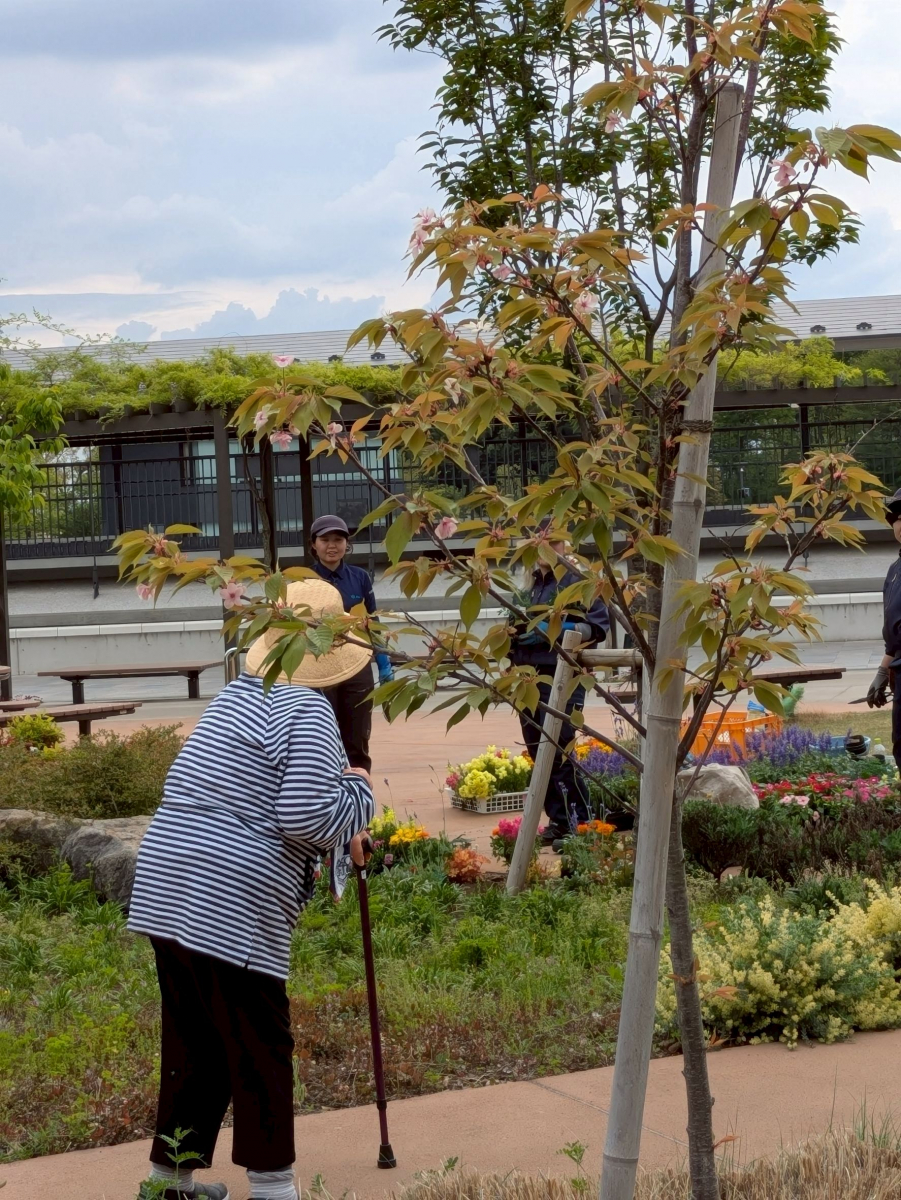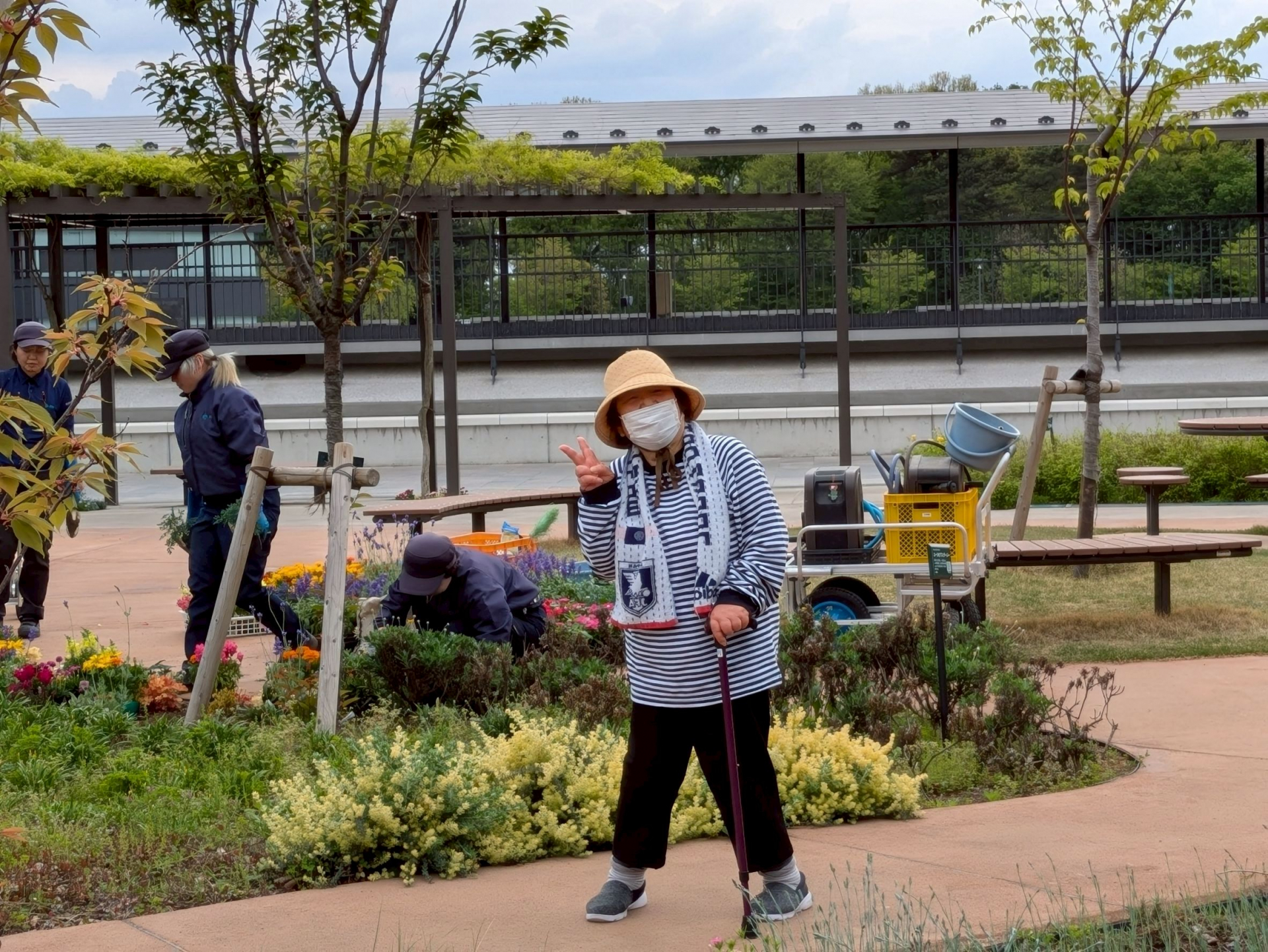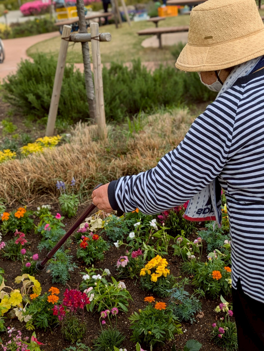 お花のお世話をされている公園の方にお花の名前をお尋ねするご利用者様♪