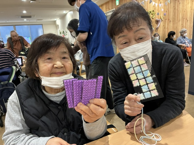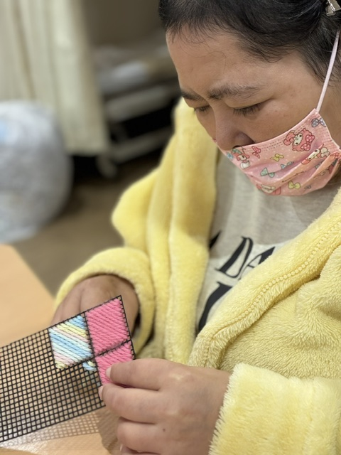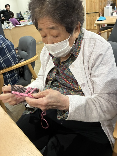 「違う色も混ぜてみてもいいかな」とスタッフと話しながら毛糸の色味を変えながら作業に集中(/・ω・)/