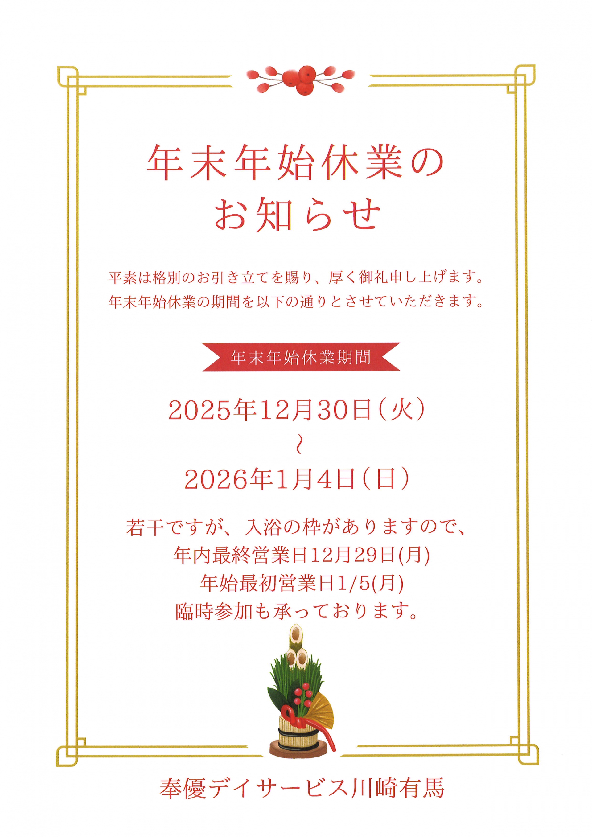 【川崎有馬デイ】年末年始休業のお知らせ