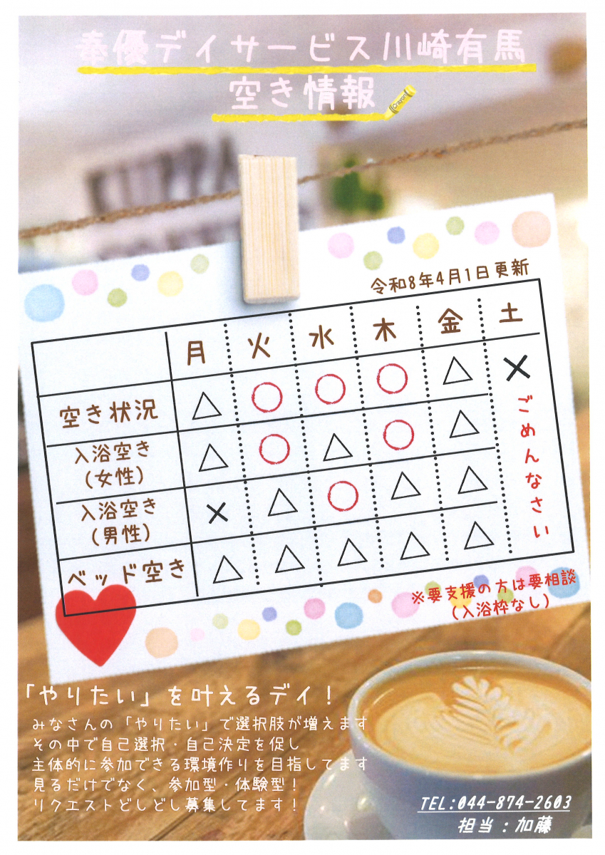 【川崎有馬デイ】空き情報を更新しました
