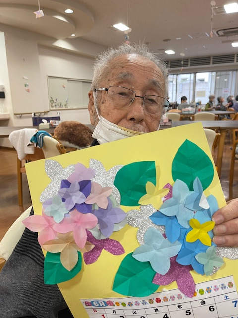 「紫がいいかしら」「私は水色がいいわ」と一枚ずつ丁寧に貼り付け、完成すると皆様の笑顔の花も咲いていました。