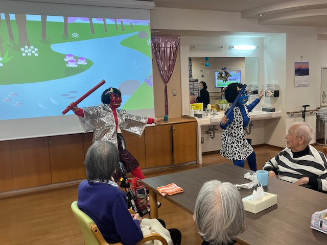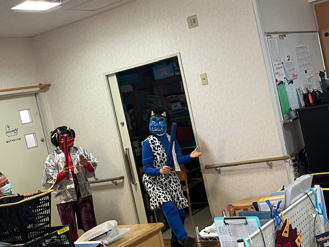 おやつ作り皆さんで力を合わせて作った「節分洋風どら焼き」を美味しく召し上がっていると突然!!赤鬼と青鬼が乱入してきました!!!!!