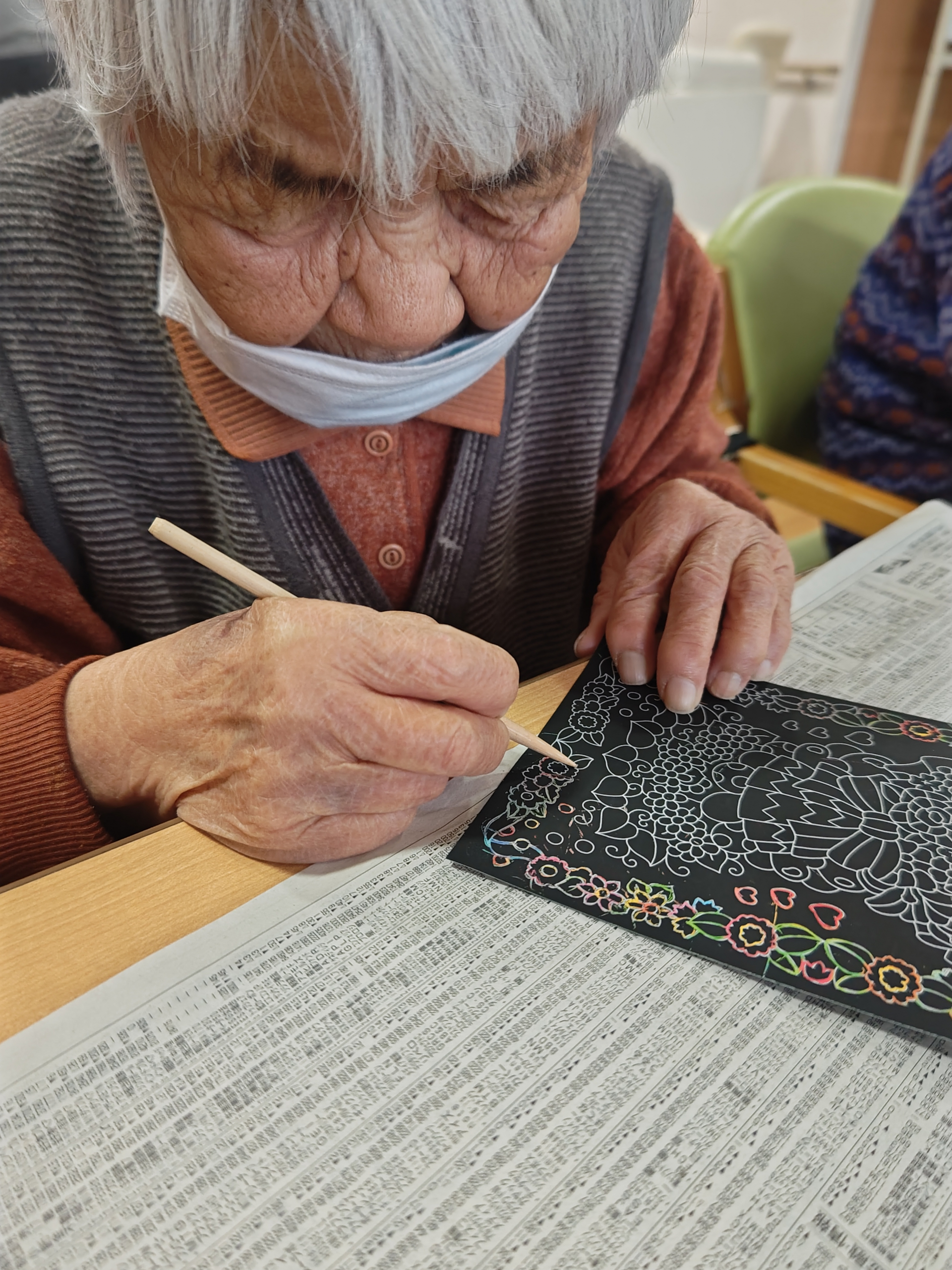 編み物クラブ、スクラッチアート、上肢のゲームです。