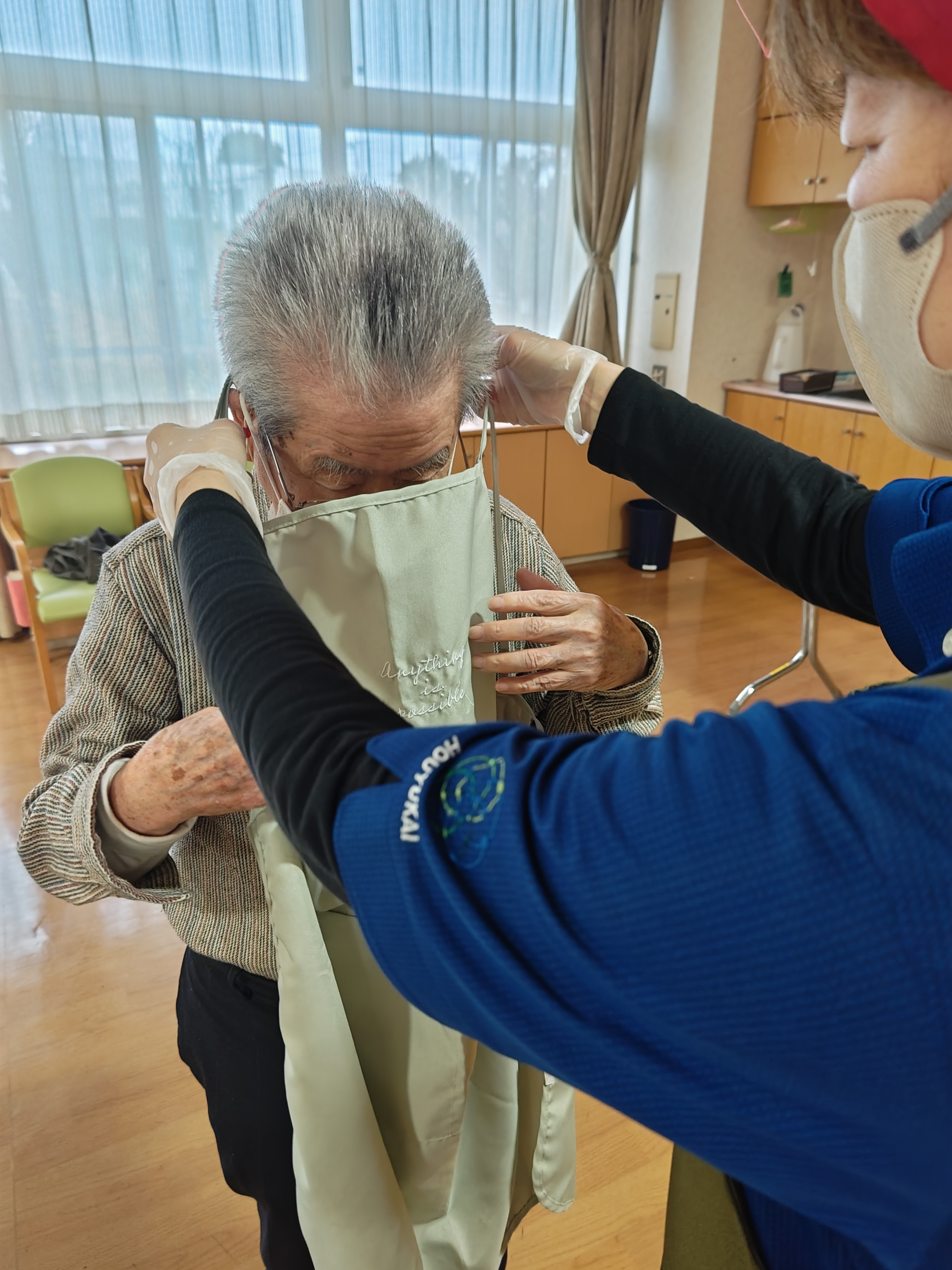 手洗い、消毒、エプロン、三角巾、手袋をして準備万端です。