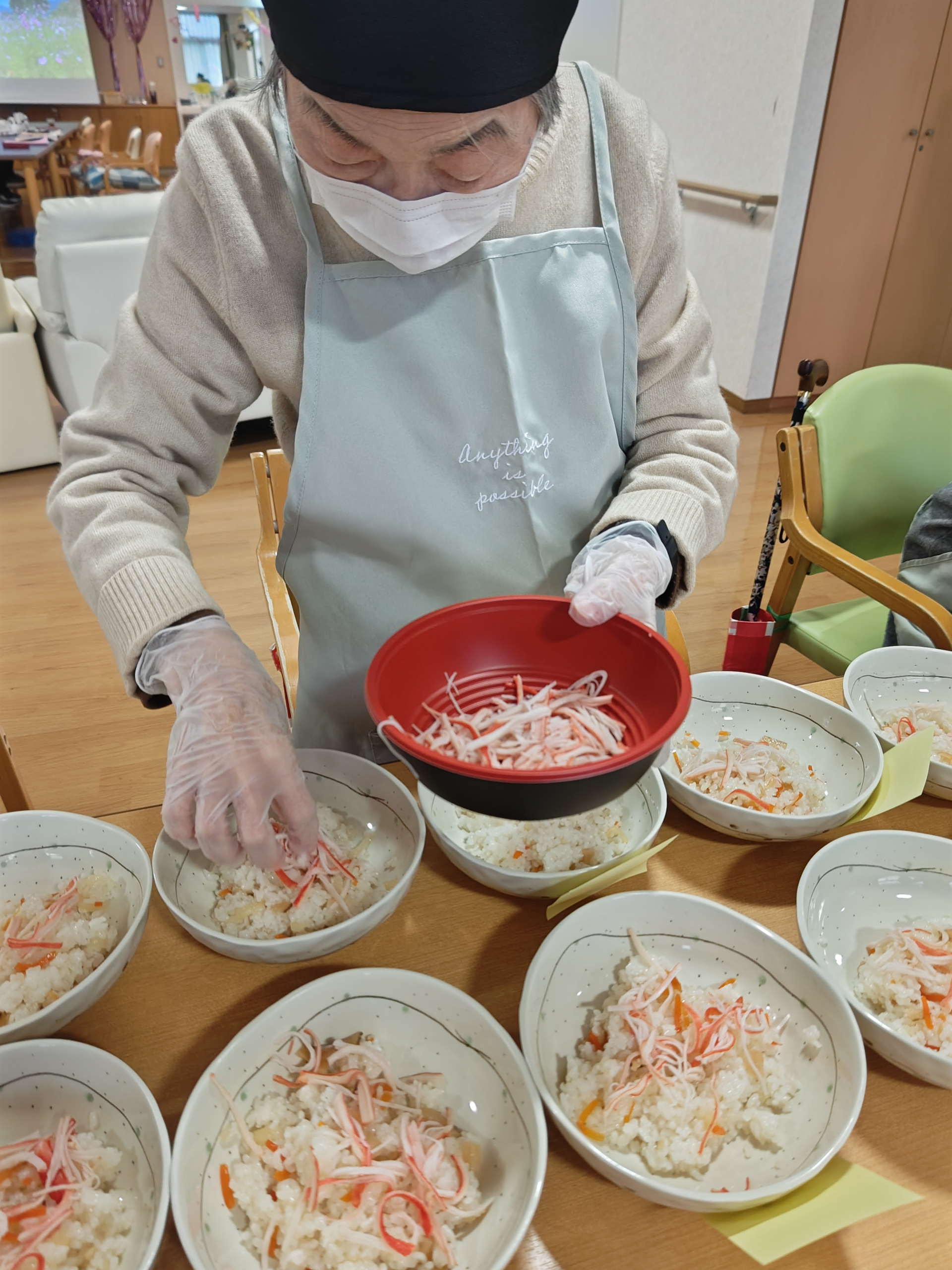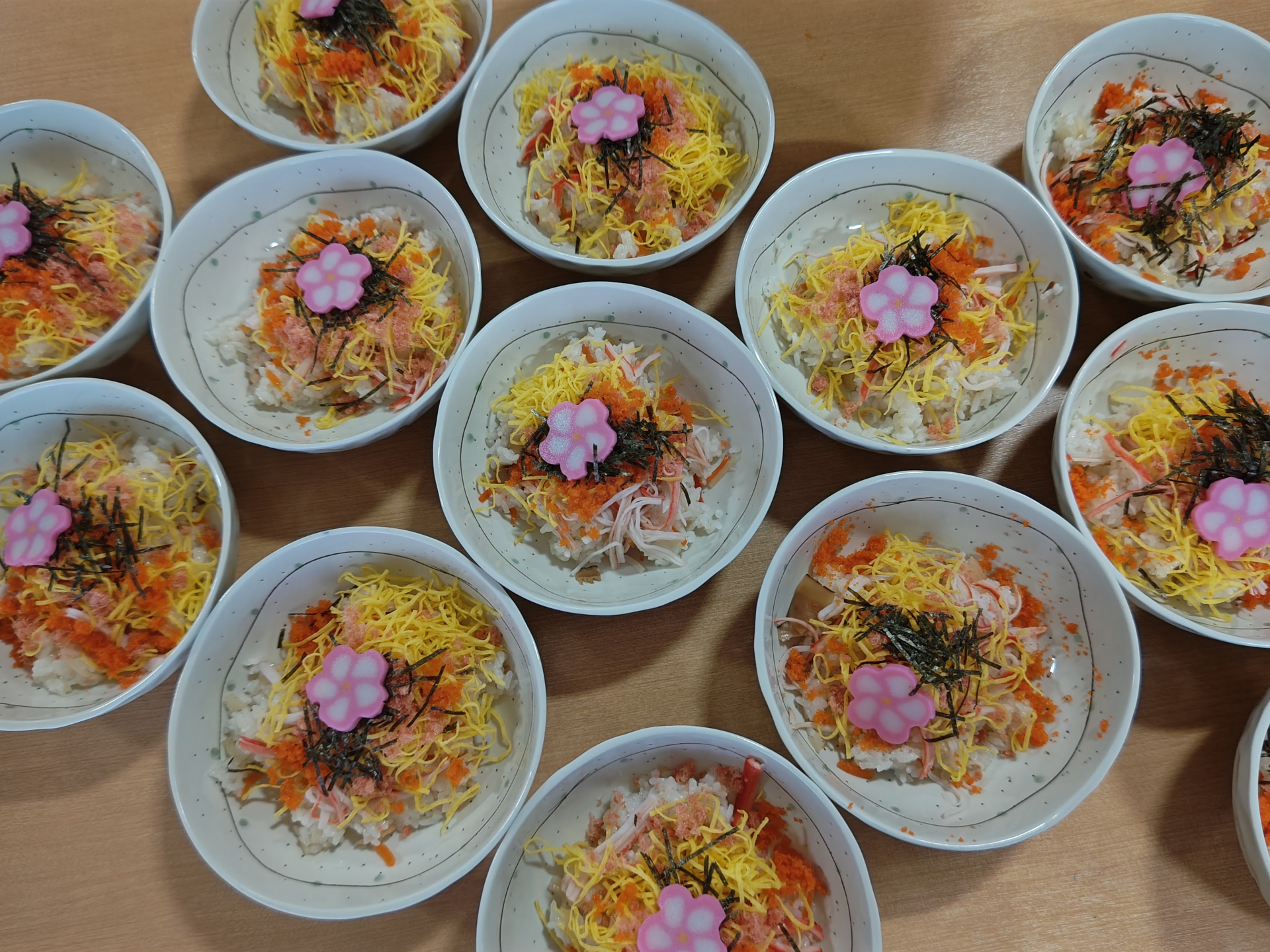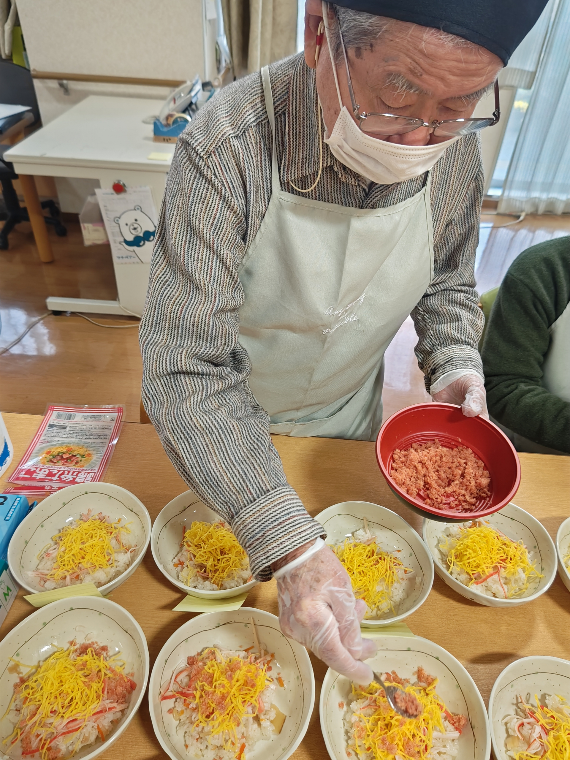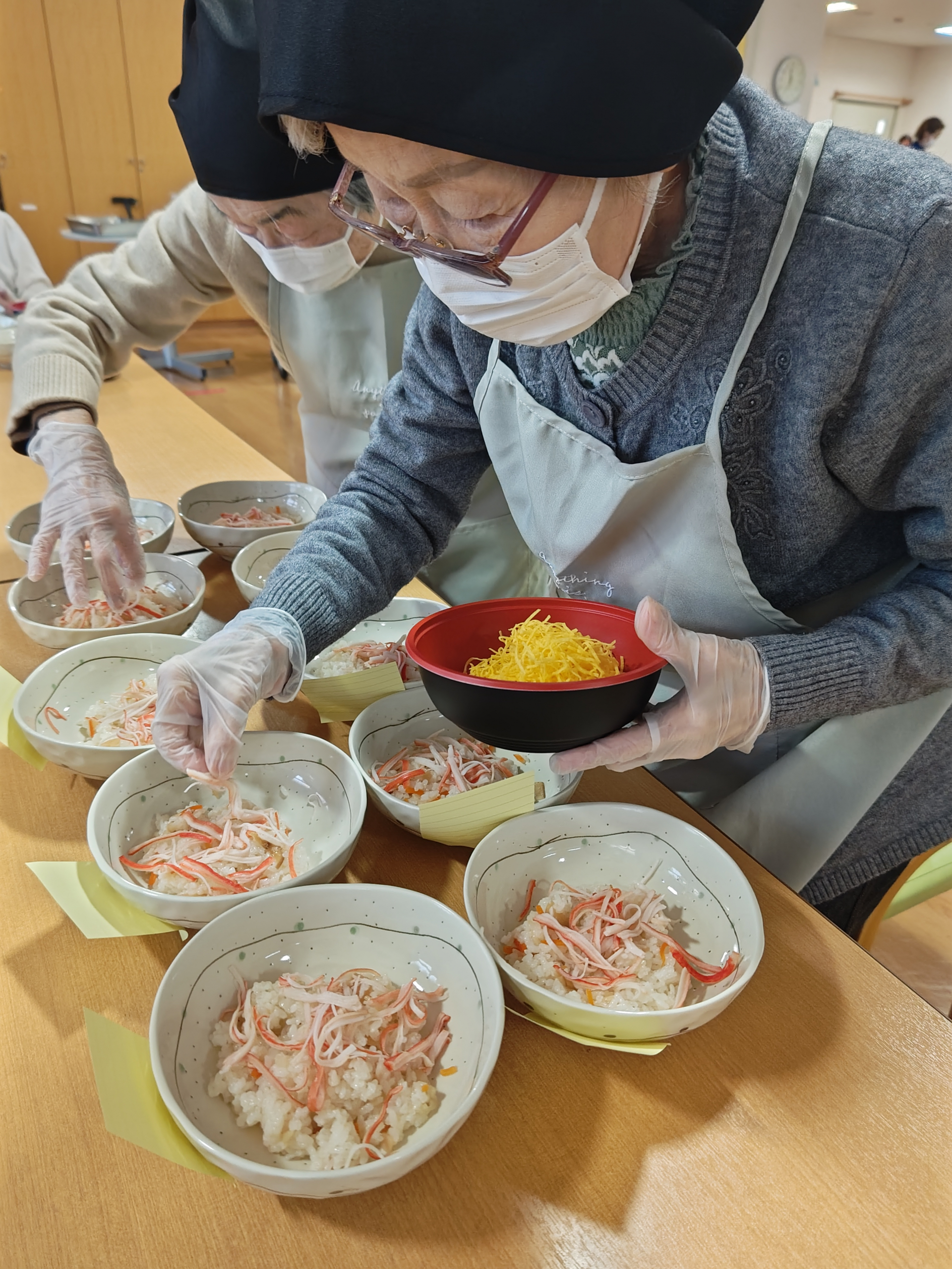 カニかま、錦糸玉子、とびっこ、海苔、お花のかまぼこを皆さまで彩りよく盛り付けました。「これが多いかな?こっちは少し少ないね」と声を掛け合いながら、均等になるように調整される姿がとても微笑ましかったです。