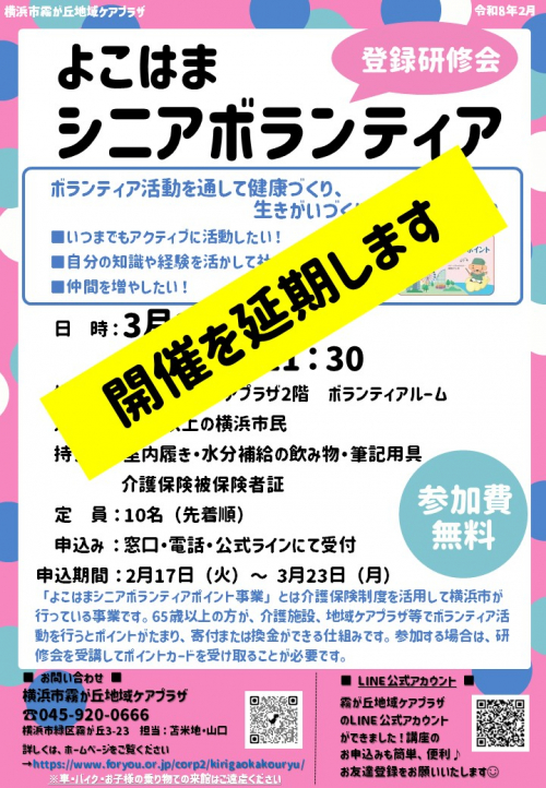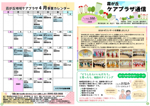 2026.03.26 毎月恒例「ぬりえアート」開催♪ 活動報告 2026.03.23 【横浜市霧が丘地域ケアプラザ】親子deヨガクラスを開催します(*^-^*) お知らせ 2026.03.23 【横浜市霧が丘地域ケアプラザ】よこはまシニアボランティア研修会延期のお知らせ お知らせ 2026.03.23 【横浜市霧が丘地域ケアプラザ】令和8年4月横浜市霧が丘地域ケアプラザ開館時間のお知らせ 活動報告 2026.03.23 【横浜市霧が丘地域ケアプラザ】4月事業カレンダーができました! お知らせ 2026.03.22 【霧が丘ケアプラザ】霧が丘社協ミニふれあいまつり開催! 活動報告 2026.03.22 【横浜市霧が丘地域ケアプラザ】横浜市霧が丘地域ケアプラザ「ケアプラザ通信4月号」が発行されました♪ お知らせ 2026.03.21 【横浜市霧が丘地域ケアプラザ】運営協議会を開催しました。 活動報告 2026.03.16 【横浜市霧が丘地域ケアプラザ】ひまわり教室の皆さんとeスポーツ♪ 活動報告 2026.03.16 【横浜市霧が丘地域ケアプラザ】霧サポ手芸班の様子♪ 活動報告 2026.03.12 【横浜市霧が丘地域ケアプラザ】スケッチのモチーフは・・・♪ 活動報告 2026.03.12 【横浜市霧が丘地域ケアプラザ】親子でLet'sEnjoyEnglishを開催しました♪ 活動報告 2026.03.10 【横浜市霧が丘地域ケアプラザ】地域の方からのおすそ分け(*^-^*) 活動報告 2026.03.06 【横浜市霧が丘地域ケアプラザ】霧が丘ほっと・る~むでボッチャ大会を開催しました! 活動報告 2026.03.04 【横浜市霧が丘地域ケアプラザ】うたごえ俱楽部を開催しました♪ 活動報告 1 2 3 … 41