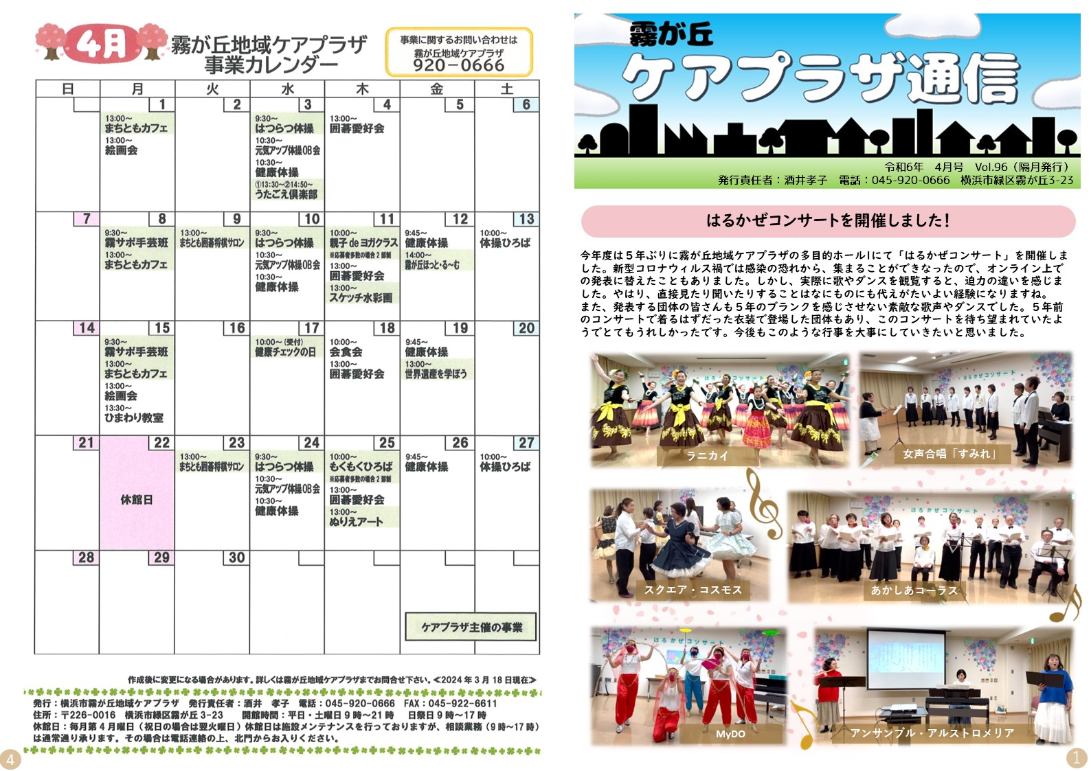 2024.03.25 お知らせ 【霧が丘地域ケアプラザ】ケアプラザ通信4月号 Tweet シェアする 霧が丘ケアプラザ通信【4月号】ができました! ぜひご覧ください☺ (K.Y) 前の記事 2024.03.27 お知らせ 【霧が丘地域ケアプラザ】はつらつ体操で脳トレ! 次の記事 2024.03.25 お知らせ 【霧が丘地域ケアプラザ】4月事業カレンダーができました! 一覧へ戻る