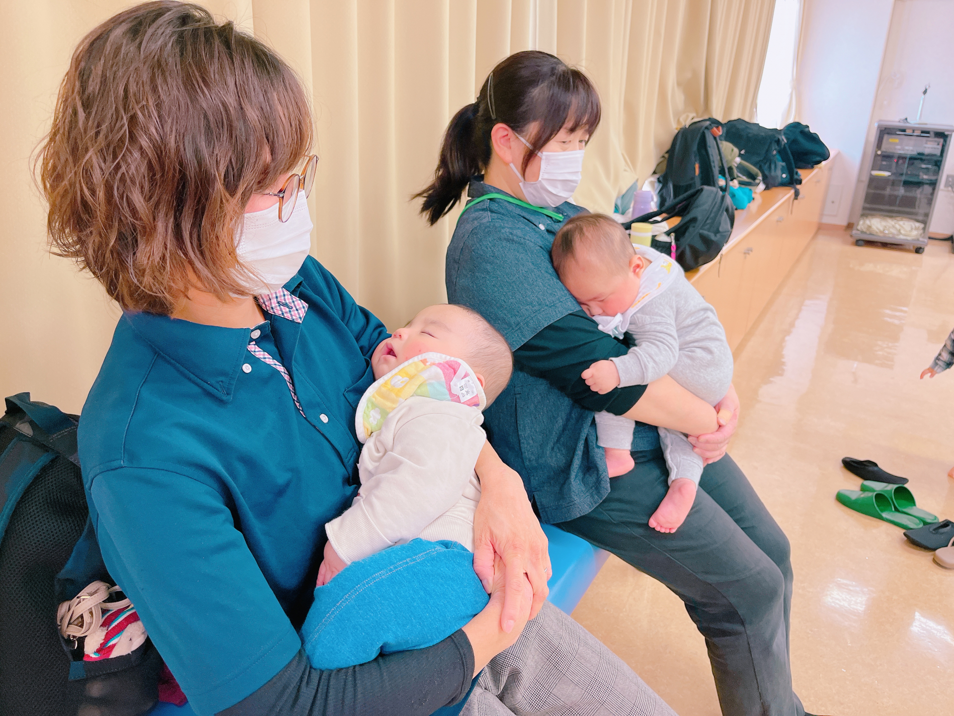 自由遊びタイムで腹ばいを頑張っていた2人のお子さまは、職員の抱っこで気持ちよさそうに眠っていました(*^-^*)