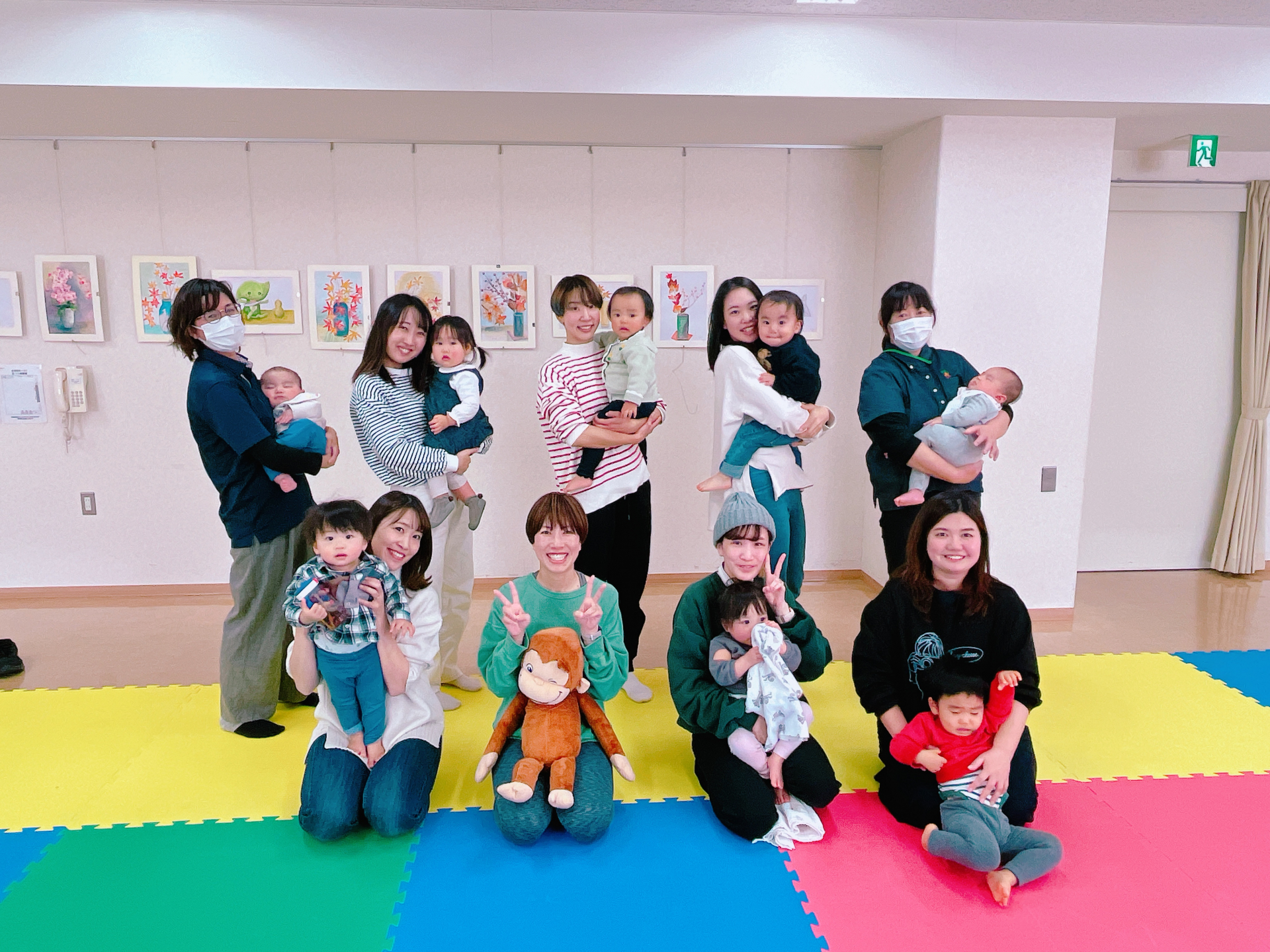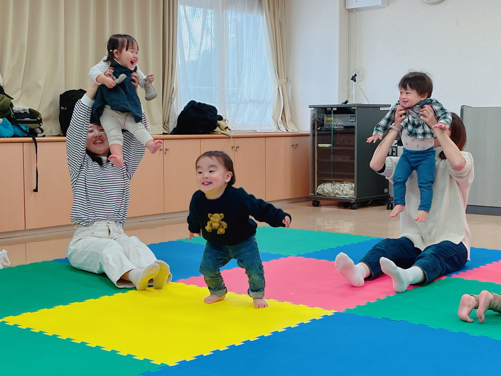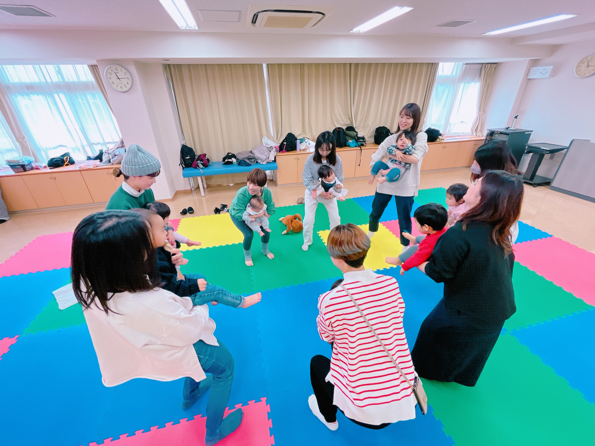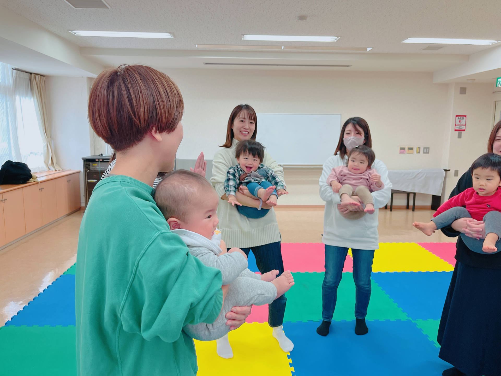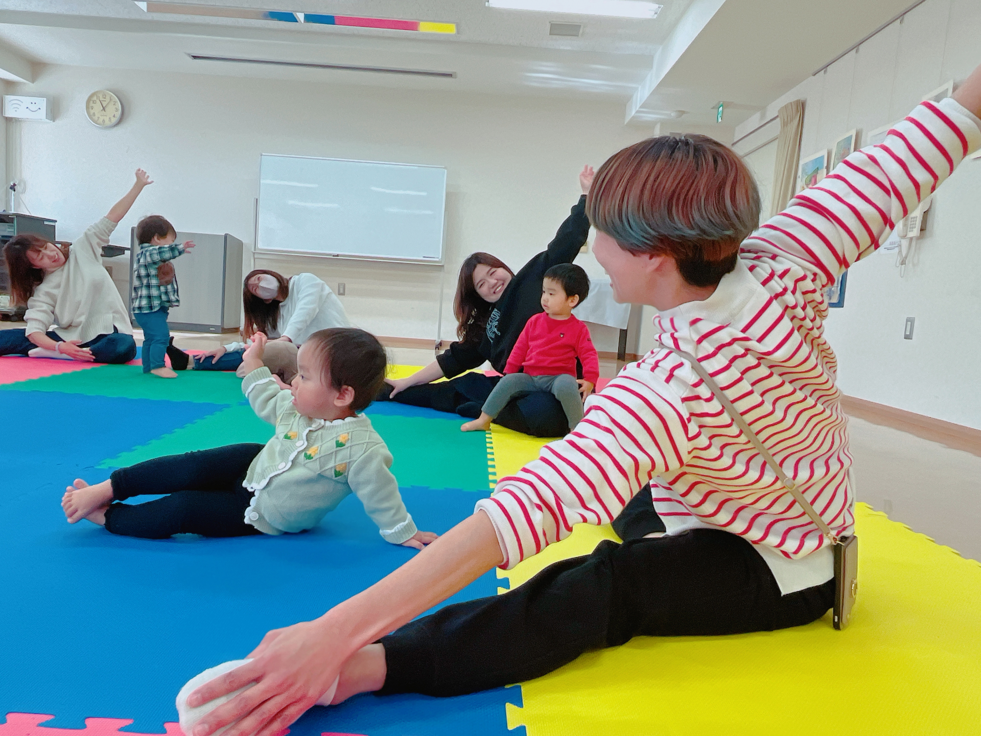 後半は、お子さまの体重の負荷を使って下半身のインナーマッスルに効くポーズ!足の冷えやむくみの解消が期待できると言うことで、ママ達頑張りました(*'▽')お子さまたちはだんだん真ん中に集まってくることが楽しくてにこにこ♪