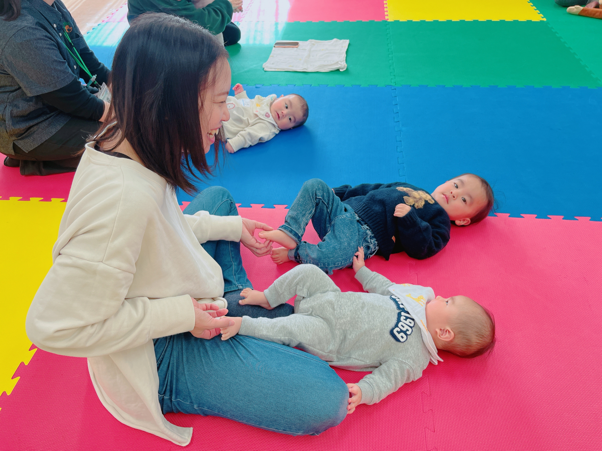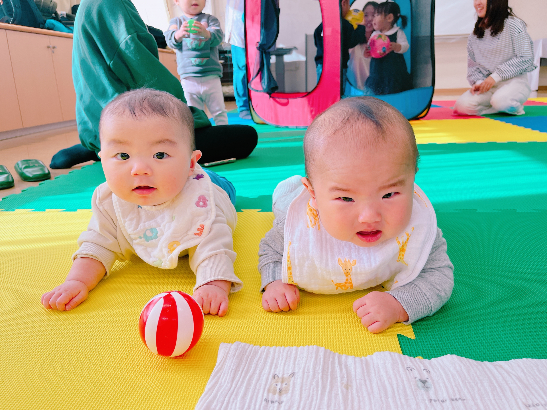 小さな月齢の子も腹ばいで一生懸命ボールを掴んで遊んでいました♪