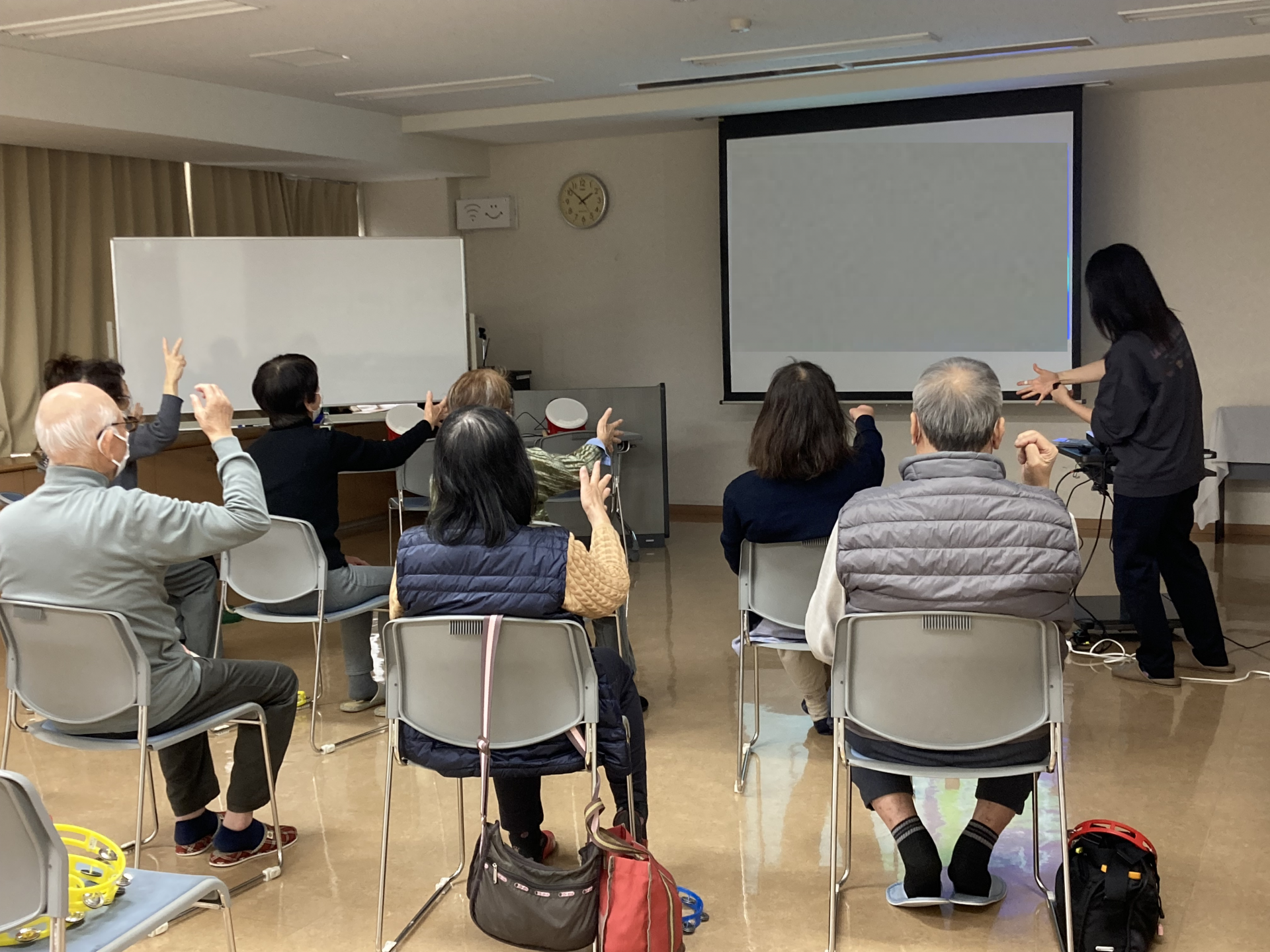 みなさま、eスポーツは初めての方で、ゲーム機の使い方を講師の先生にレクチャーしてもらいながら楽しみました。脳トレでは、画面に表示された手とじゃんけんをしました。じゃんけんではなく、手の表示と一緒に「かってください」や「まけてください」と表示されますので、リモコンについているセンサーに向かって後出しでじゃんけんをするというもの!センサーが認識し、画面に参加者が出したじゃんけんが表示され、合っていれば大きな〇が表示されました!これが面白いことに、みんな勝ちたくなってしまう。(笑)みんなで、大笑いしながら楽しんでいました!