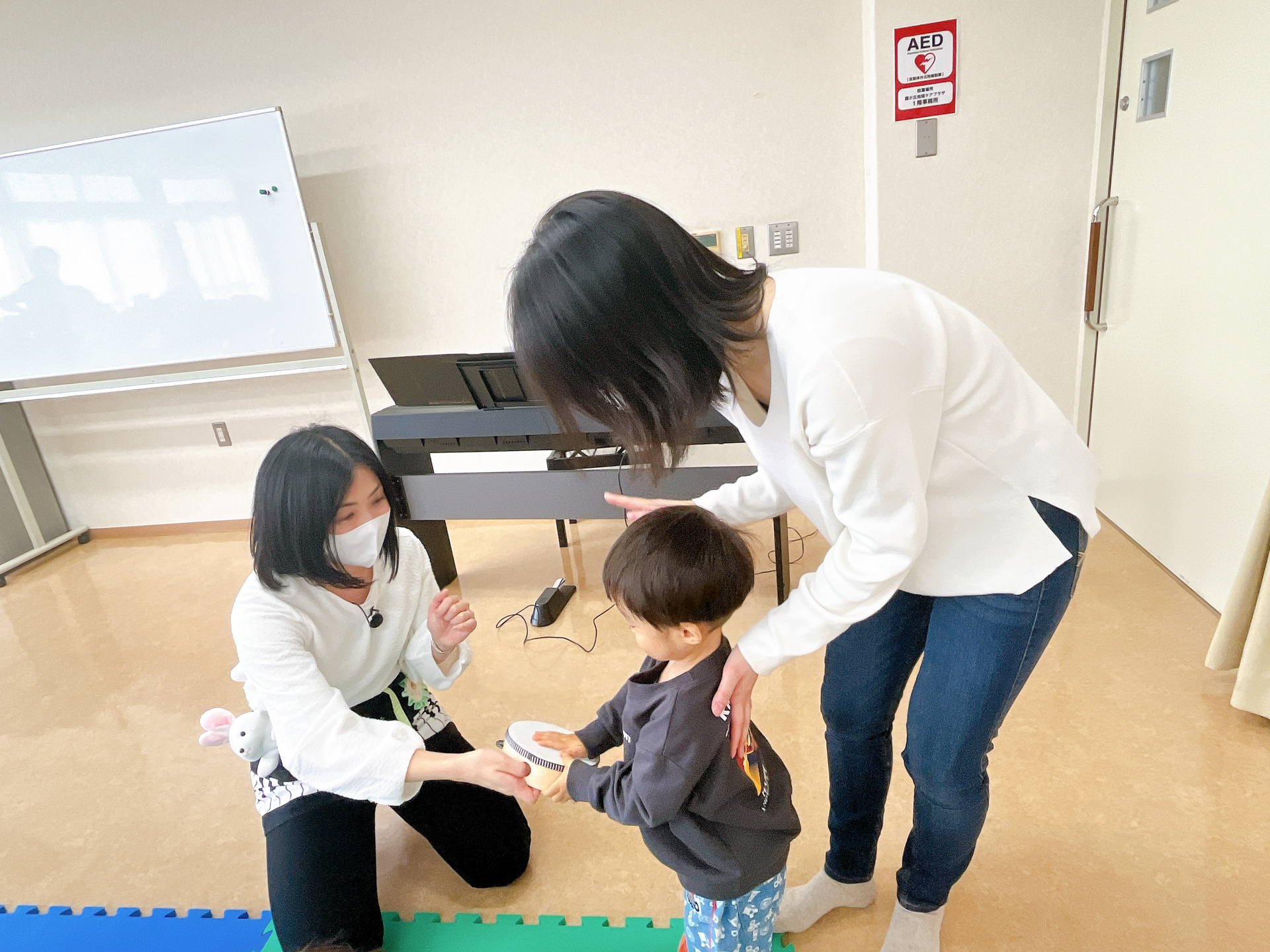 次は、お名前を呼ぶので、タンブリンをたたいてお返事してみよう♪ちなみに「タンバリン」という表現がなじみのある方が多いと思いますが、教科書の改訂と共に「タンブリン」が正式名称になったそう。先生からのプチ情報も交えながら楽しくリトミックが進みます!