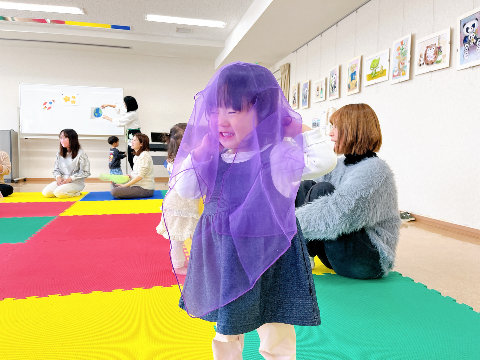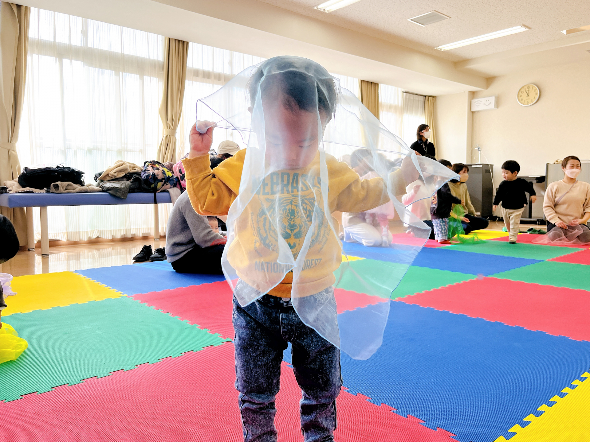 つぎは、カラースカーフを使って、音に合わせて動かしてみよう~