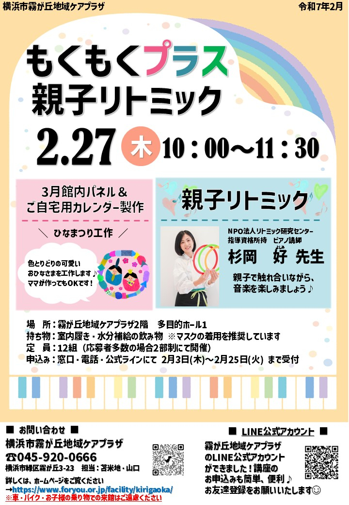 館内パネルとご自宅用カレンダーの製作と、リトミック講師の杉岡好先生をお迎えして「親子リトミック」を開催します☺