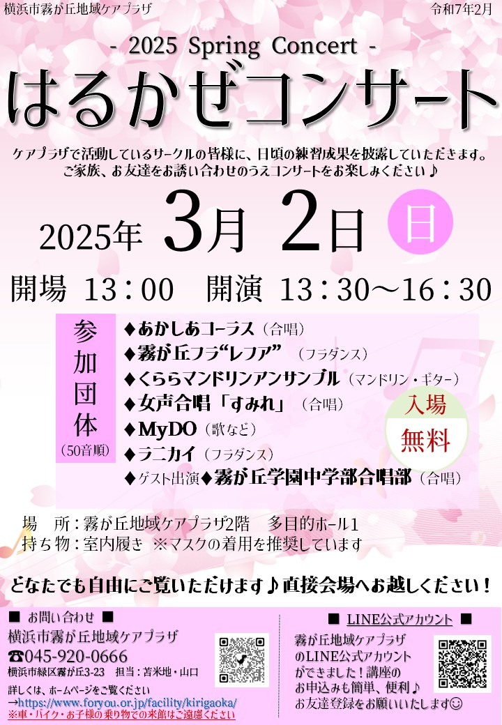 2025年3月2日(日)に『はるかぜコンサート』をケアプラザの会場で開催します♪