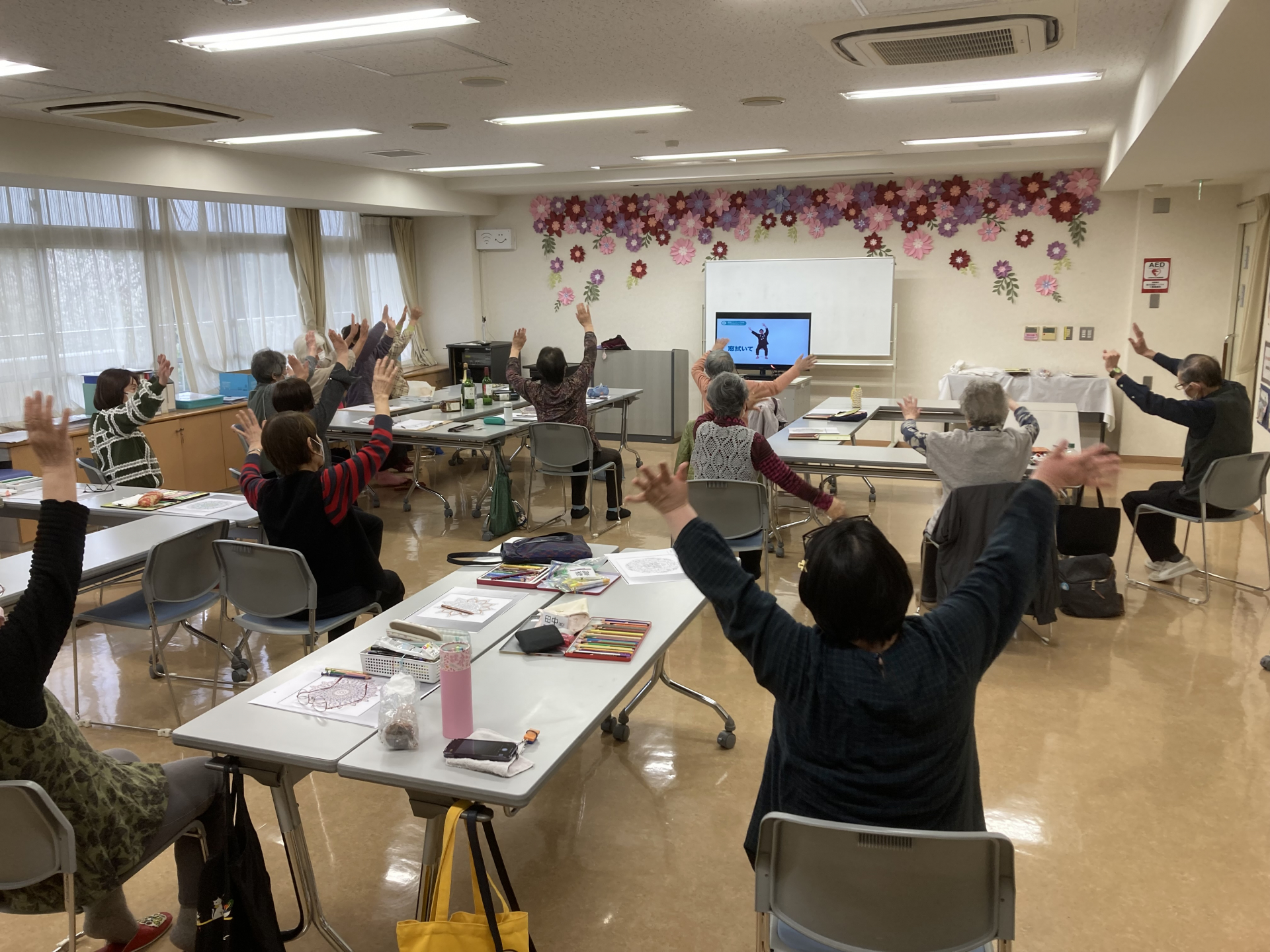 長い時間細かい作業に集中していると疲れてしまうので、途中みんなで体操をしたり、カフェコーナーのコーヒーを飲んでほっと一息♪
