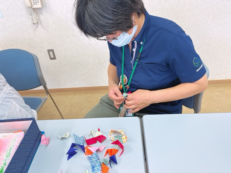 こちらでは、折り紙が得意な参加者様からレクチャーを受けて作品作りに励む職員!