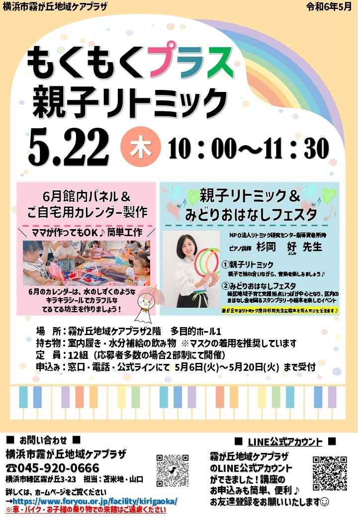 館内パネルとご自宅用カレンダーの製作と、リトミック講師の杉岡好先生をお迎えして「親子リトミック」&みどりおはなしフェスタを開催します☺