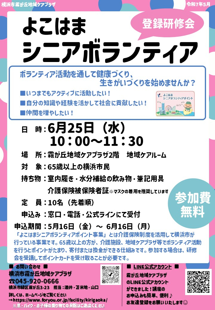 【霧が丘地域ケアプラザ】よこはまシニアボランティアポイント登録研修会受付中!