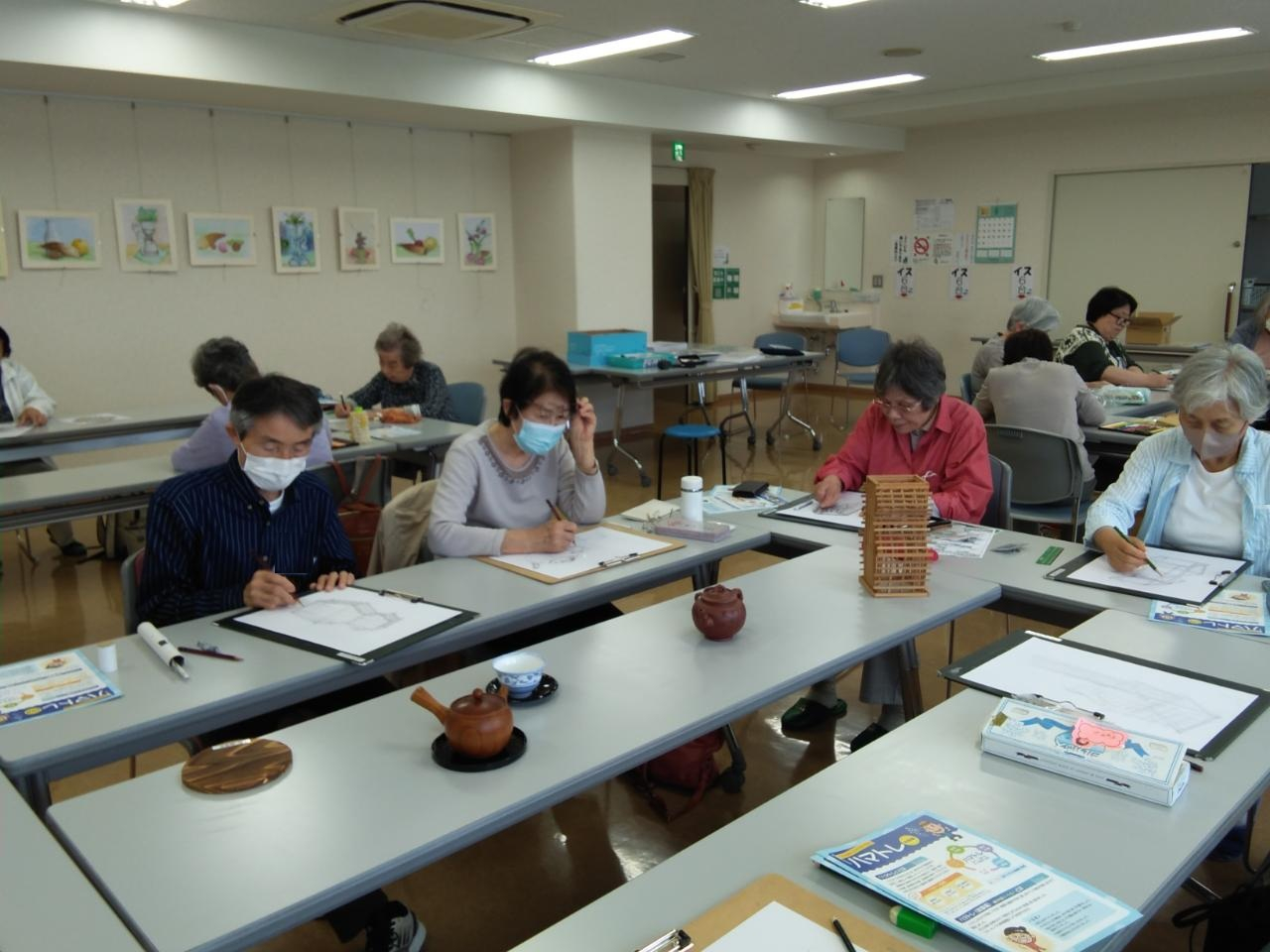 第1月曜日のまちともカフェでは「デッサン」を楽しめます!今回は急須や湯飲みなどの茶器をモチーフにデッサンを楽しんでいました♪急須の丸みや、渋く温かみのある色合いを表現することに苦戦している様子でしたが、先生にアドバイスをもらいながら表現方法を学んだり、参加者同士で良いところを見合って作品の完成に励んでいました(*^-^*)