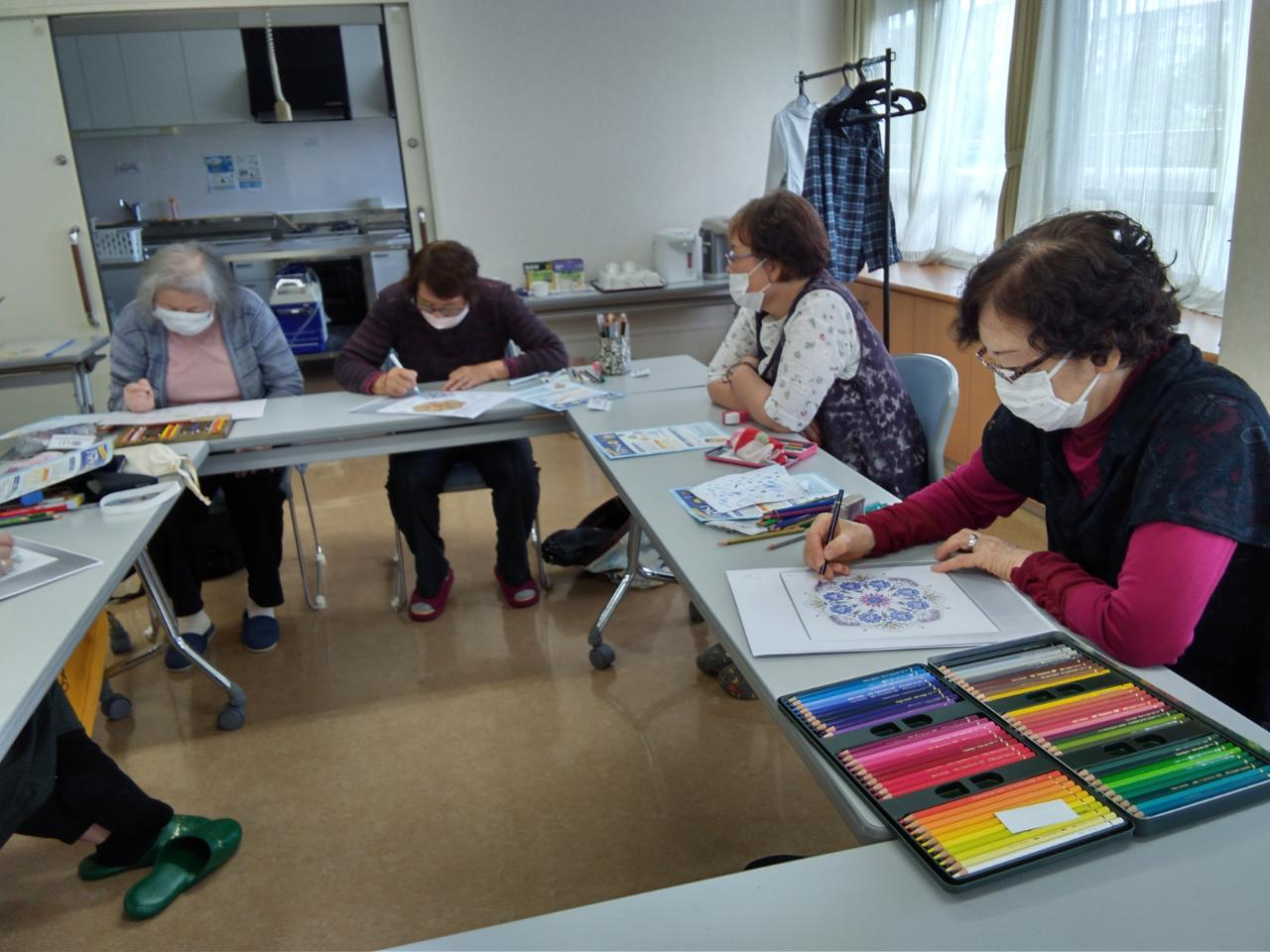 デッサンやぬりえで疲れてきた身体をみんなで体操してリフレッシュしたり、カフェコーナーのコーヒーを飲みながらお喋りしてホッとしたり、参加者みなさんのお好きな時間の過ごし方をしていただきました♪