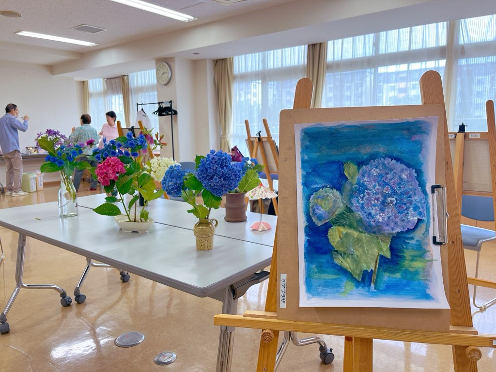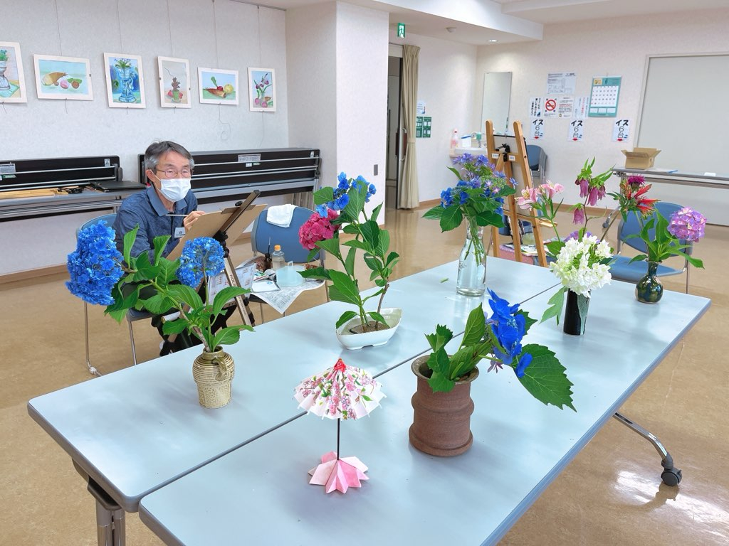 今回の題材は、参加の方がお庭からアジサイなどの花をたくさん持ってきてくださいました!!