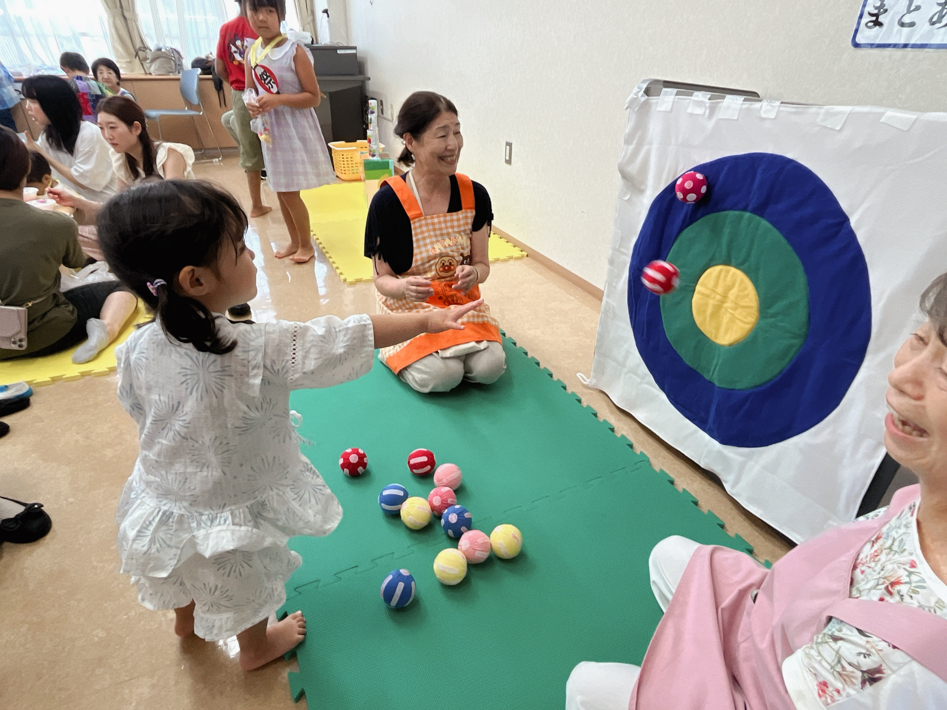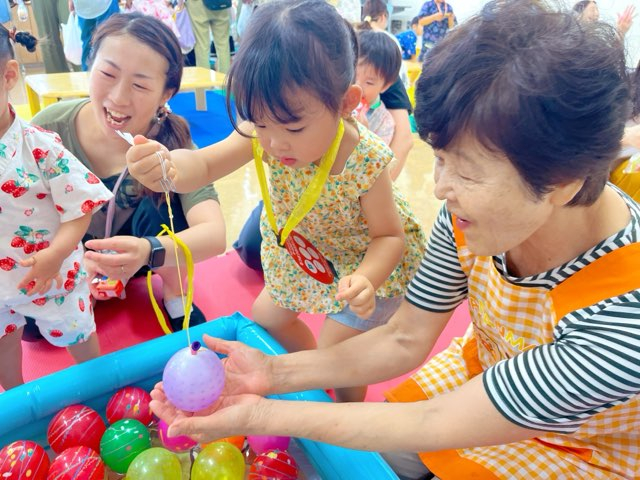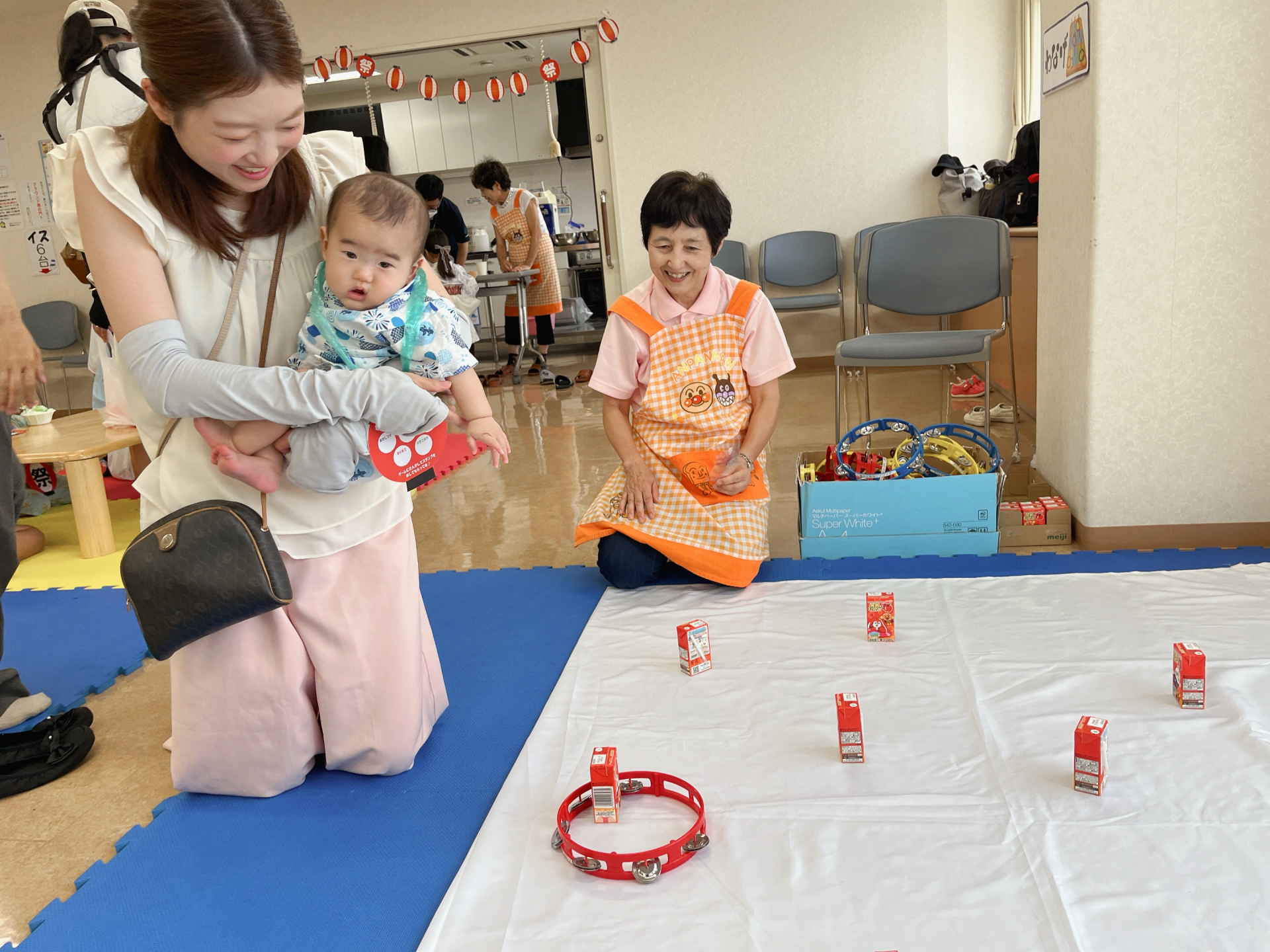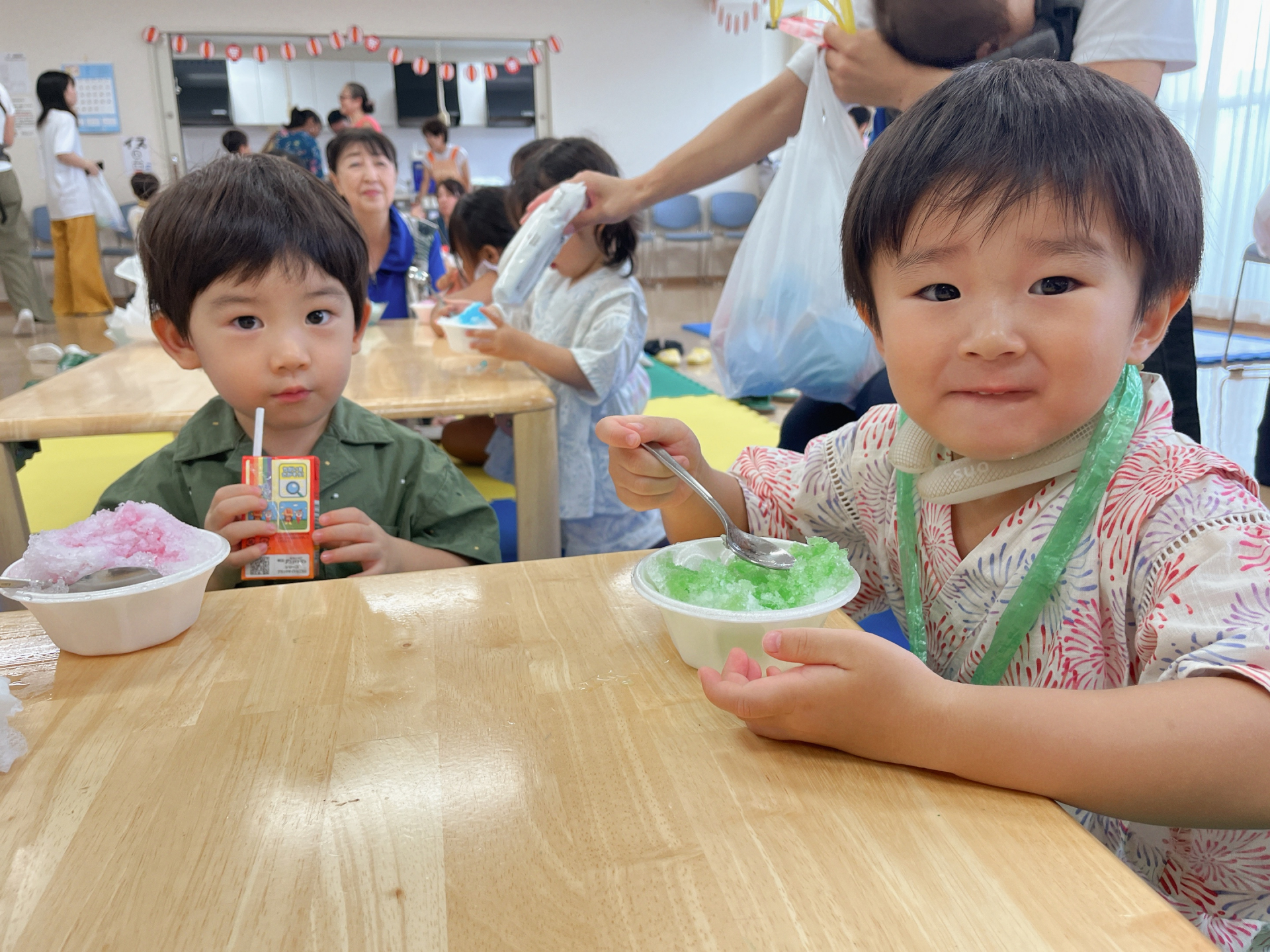 お菓子釣りに、ヨーヨー釣り、ジュースわなげ、まとあて!4つのブースを楽しんでボランティアの方からシールを貼ってもらったら、かき氷を食べよう!