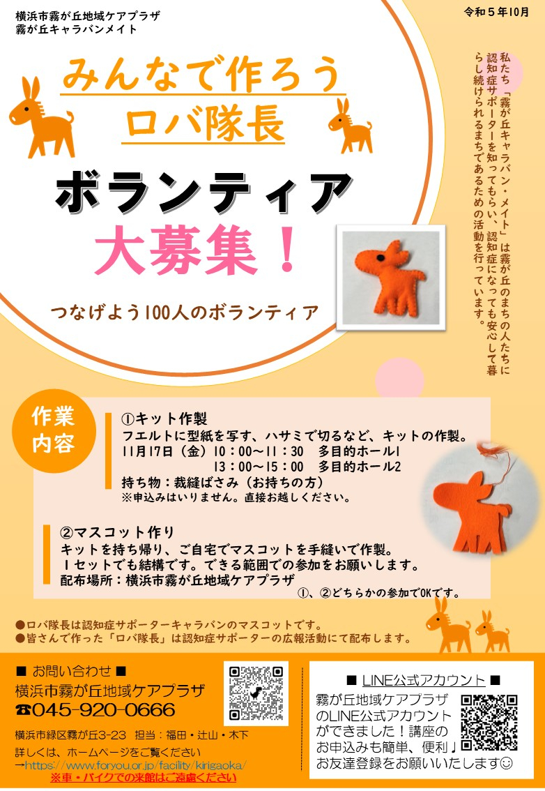 マスコットをボランティア皆さんで作っていただき、認知症サポーターの広報活動にて配布します!