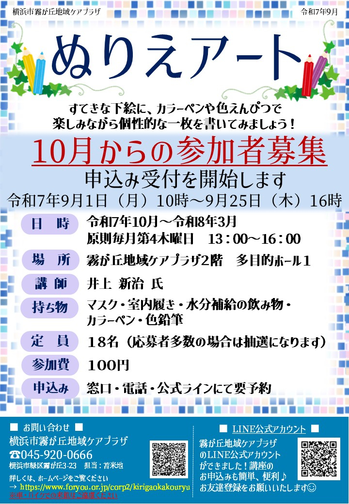 【横浜市霧が丘地域ケアプラザ】10月からのぬりえアート参加者募集スタート!