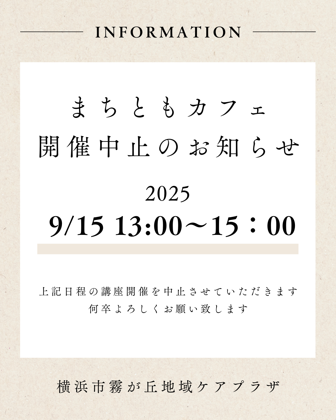 2025.09.11 お知らせ 【横浜市霧が丘地域ケアプラザ】9/15「まちともカフェ」は開催中止いたします。 Tweet シェアする 横浜市霧が丘地域ケアプラザ K.Y 前の記事 2025.09.11 お知らせ 【横浜市霧が丘地域ケアプラザ】9/12「霧が丘あおぞらほっと・る~む」は開催中止いたします。 次の記事 2025.09.11 お知らせ 【横浜市霧が丘地域ケアプラザ】今月のスケッチ水彩画のモチーフも盛りだくさん! 一覧へ戻る