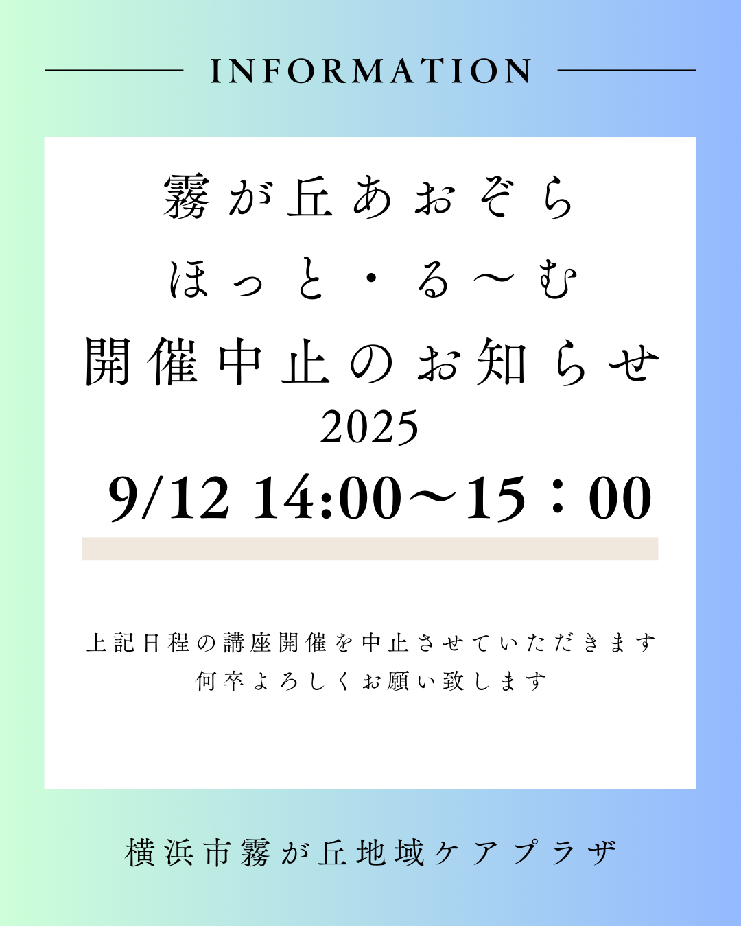 2025.09.11 お知らせ 【横浜市霧が丘地域ケアプラザ】9/12「霧が丘あおぞらほっと・る~む」は開催中止いたします。 Tweet シェアする 横浜市霧が丘地域ケアプラザ K.Y 前の記事 2025.09.18 お知らせ 【横浜市霧が丘地域ケアプラザ】「もくもくひろば」9月24日より受付開始☆ 次の記事 2025.09.11 お知らせ 【横浜市霧が丘地域ケアプラザ】9/15「まちともカフェ」は開催中止いたします。 一覧へ戻る