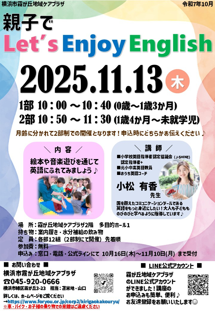 【横浜市霧が丘地域ケアプラザ】受付開始!「親子でLet'sEnjoyEnglish」