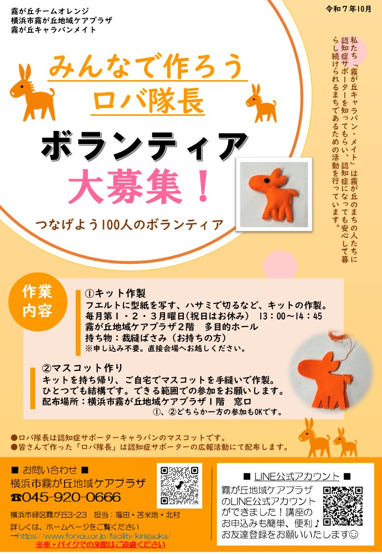 ロバ隊長とは、認知症になっても安心して暮らし続けられるまちであるための活動を行っている認知症サポーターキャラバンのマスコットです。マスコットをボランティア皆さんで作っていただき、認知症サポーターの広報活動にて配布します!