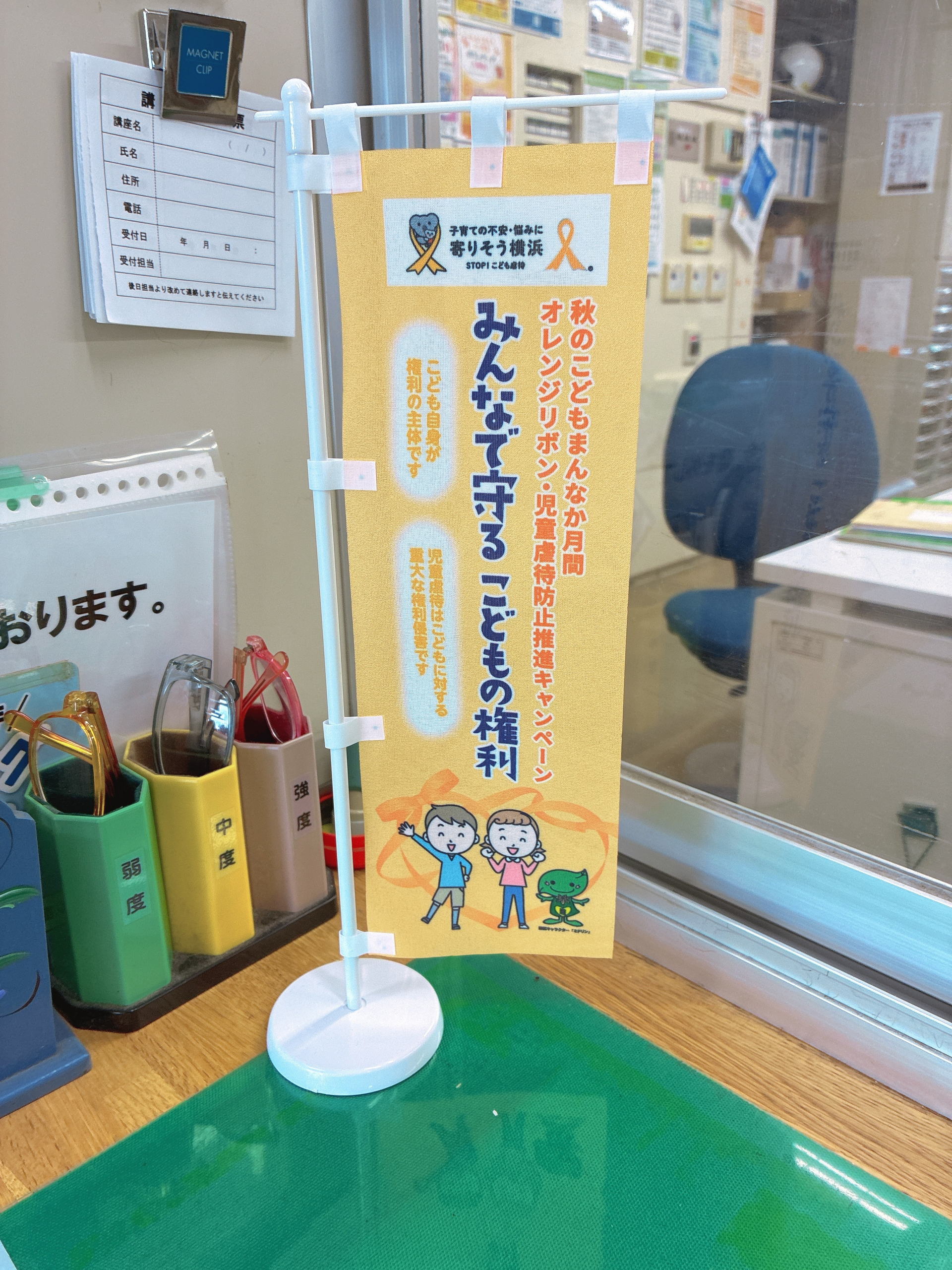 横浜市霧が丘地域ケアプラザの窓口に「オレンジリボン・児童虐待防止推進キャンペーン」のミニ旗を立てています!