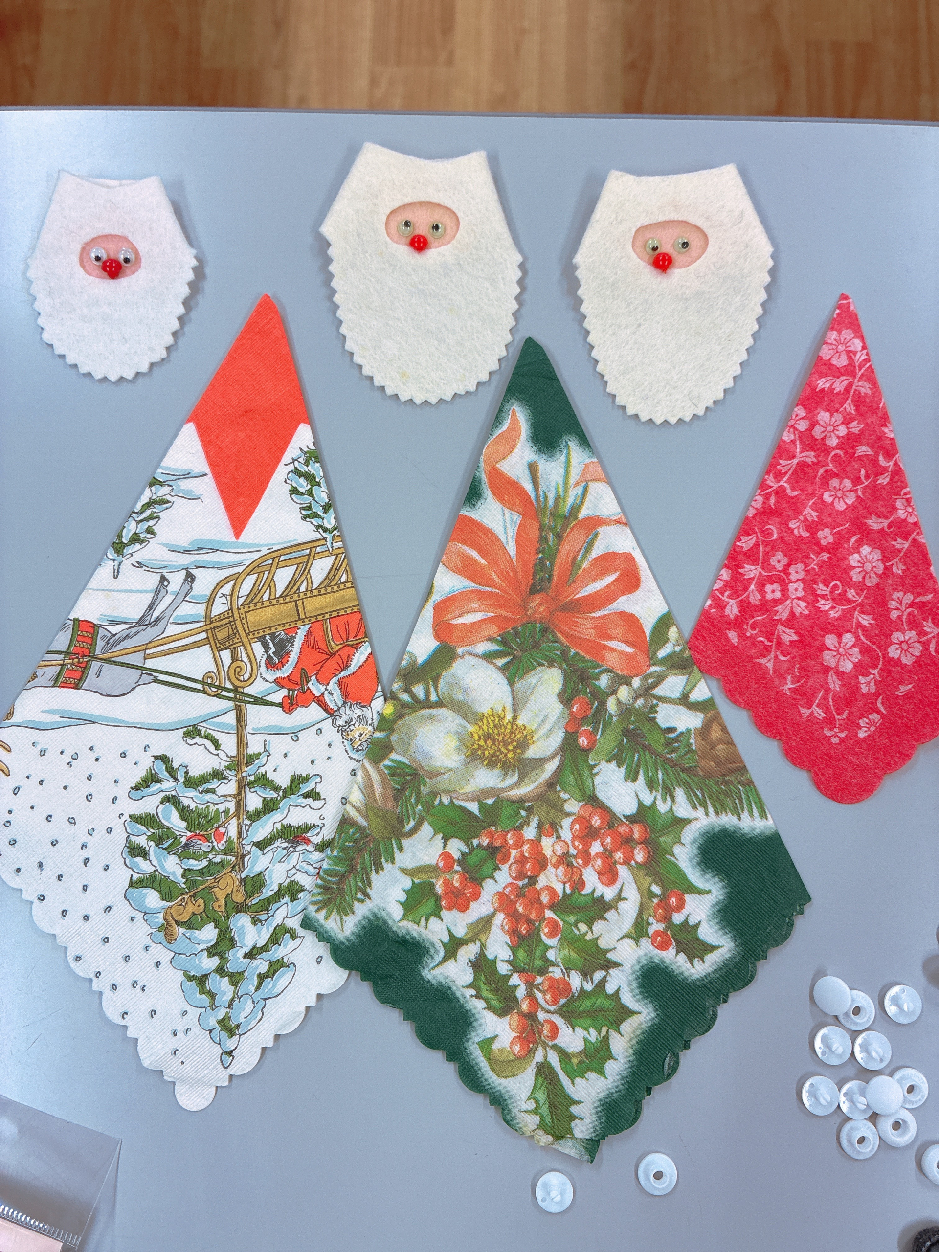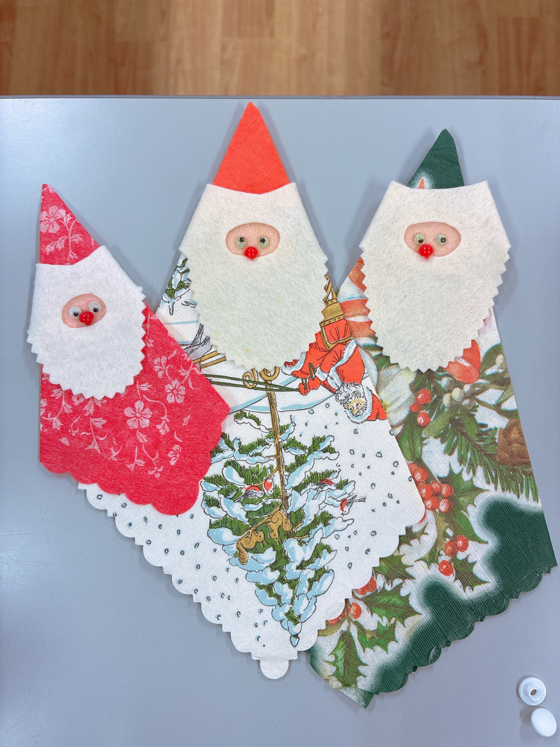 クリスマスに向けて、サンタクロースを作成していました!この帽子、実はクリスマスのペーパーナフキンのにフェルトで作ったサンタのお顔を付けただけ♪素敵なアイディアにいつも驚かされます!