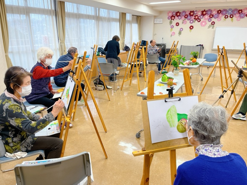 「深みをだすために色を重ねるのが楽しい」「葉っぱの形って意外と難しいの」とおっしゃていたり、描くのを苦戦している方は講師や他の参加者にアドバイスを求めたり、参加者同士、笑顔で交流していました(^^♪