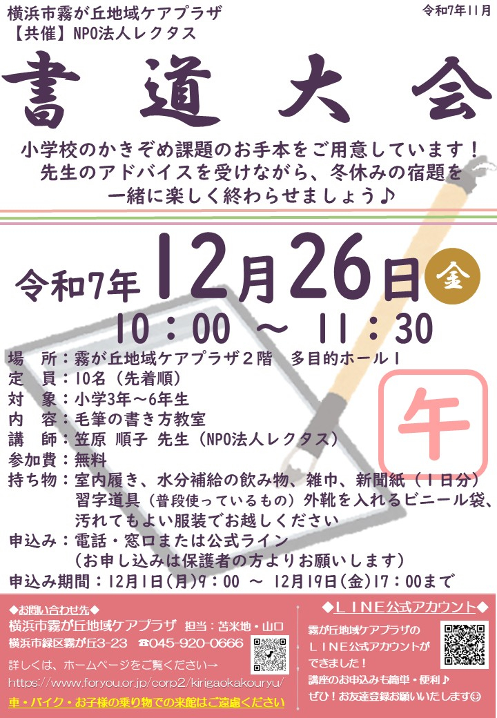 【霧が丘地域ケアプラザ】小学3~6年生対象『書道大会』ご参加受付中♪