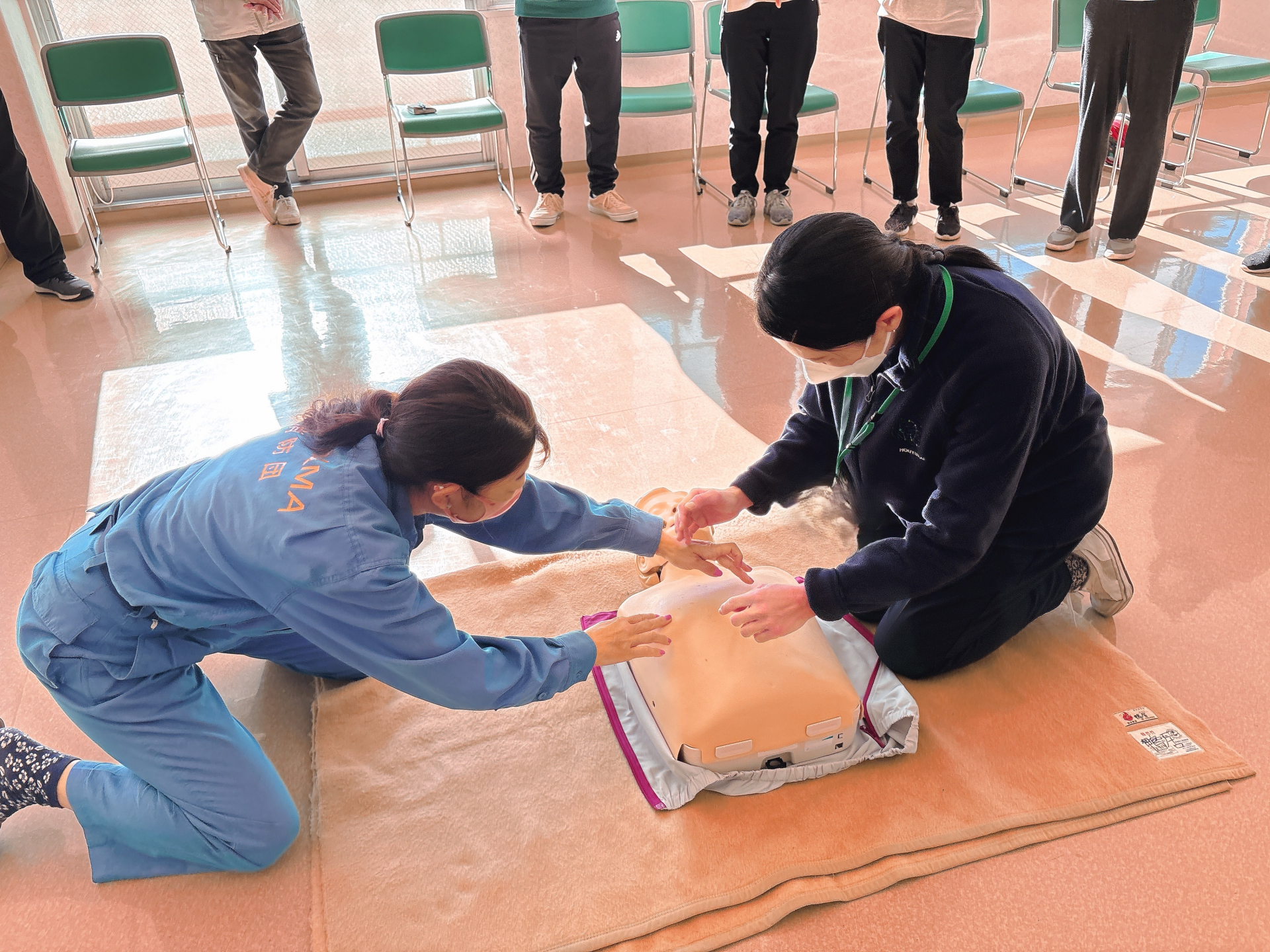 まずはAEDの仕組みと使い方について学びました。所長より「AEDは専門知識がなくても、音声ガイダンスに従ってすすめば誰でも使えるように作られています。救命の第一歩はAEDの電源を入れること!」とお話がありました。