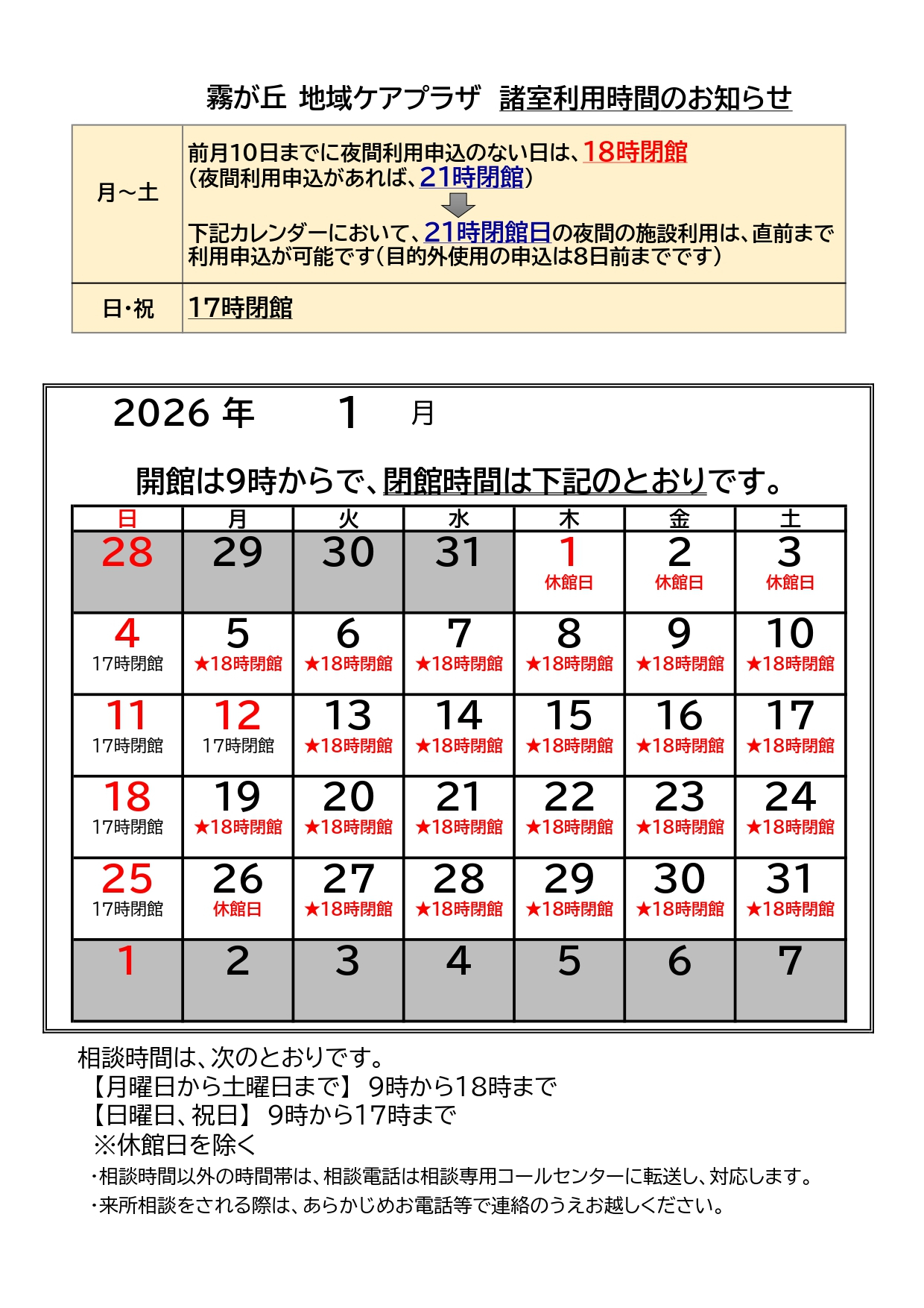 いつも霧が丘地域ケアプラザにをご利用いただきありがとうございます。 横浜市霧が丘地域ケアプラザ令和8年1月の閉館時間のお知らせです。 カレンダーをご確認のうえご来館いただきますよう、ご理解、ご協力をよろしくお願いいたします。