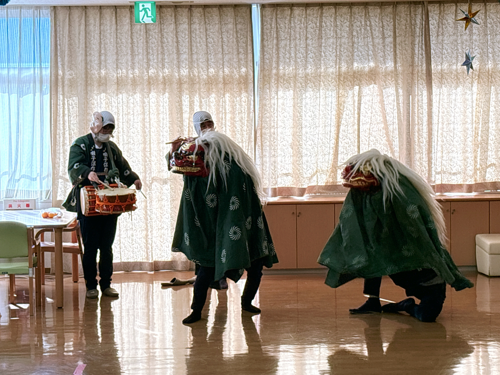 太鼓の音とともに現れた獅子の迫力ある姿にご利用者様からは思わず歓声が上がり、獅子舞の披露が始まると手拍子が自然と広がっていきました!(^^)!